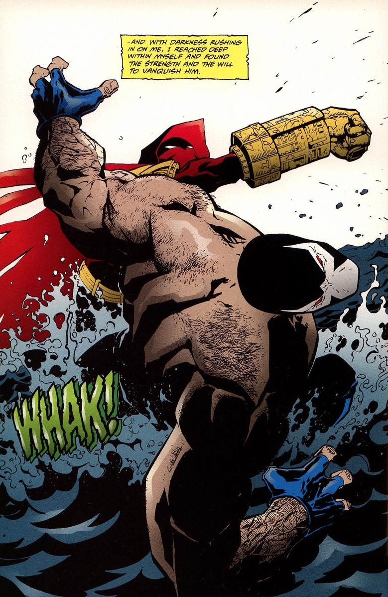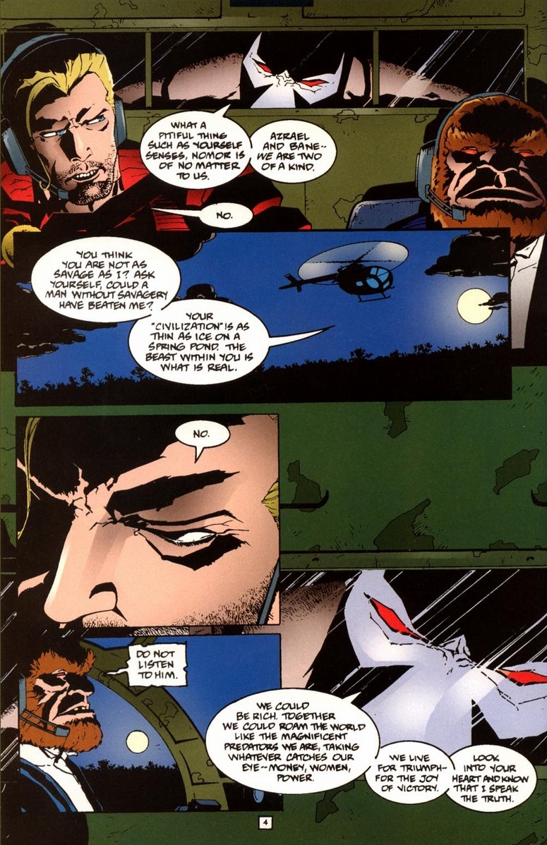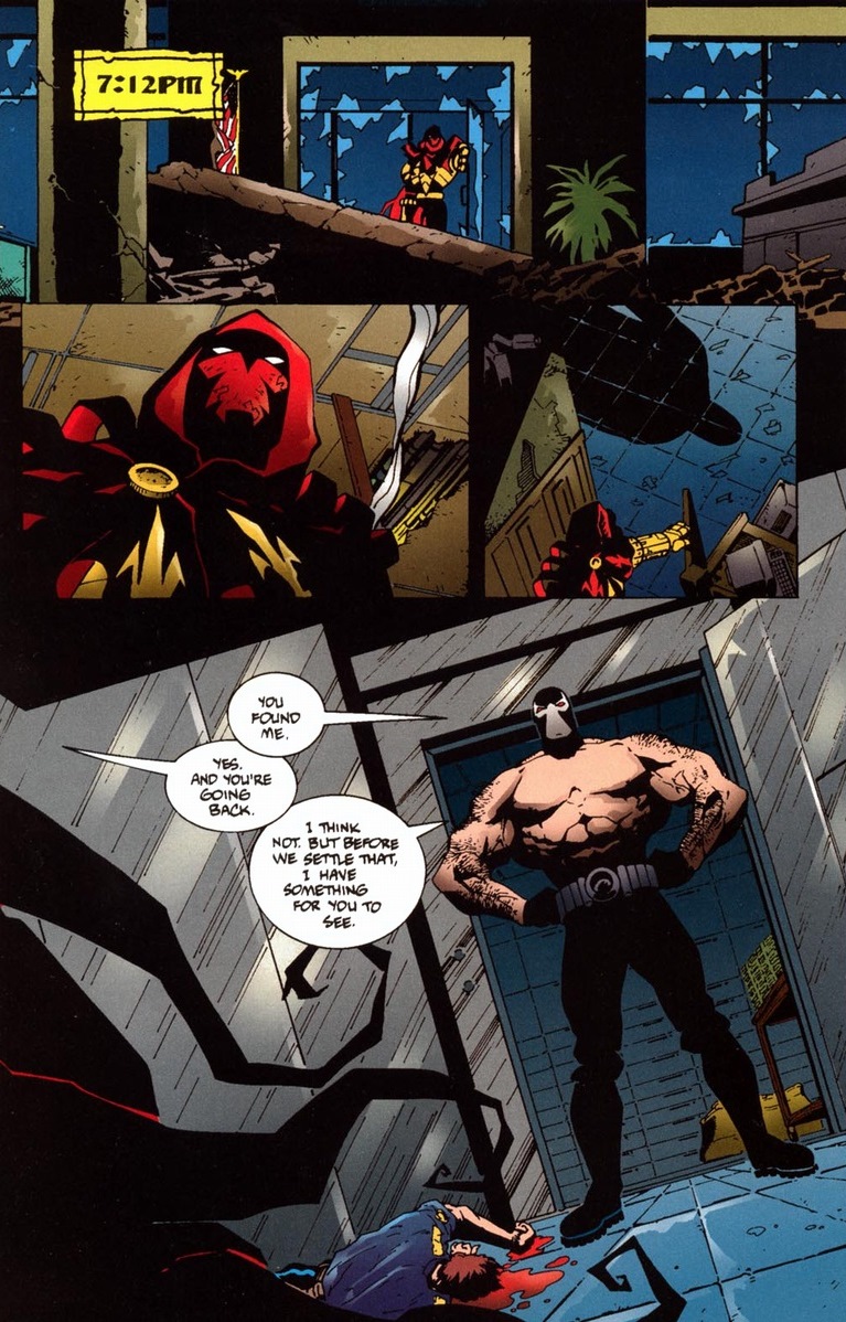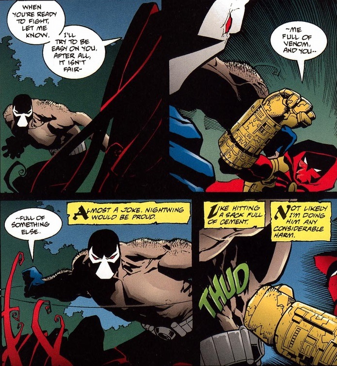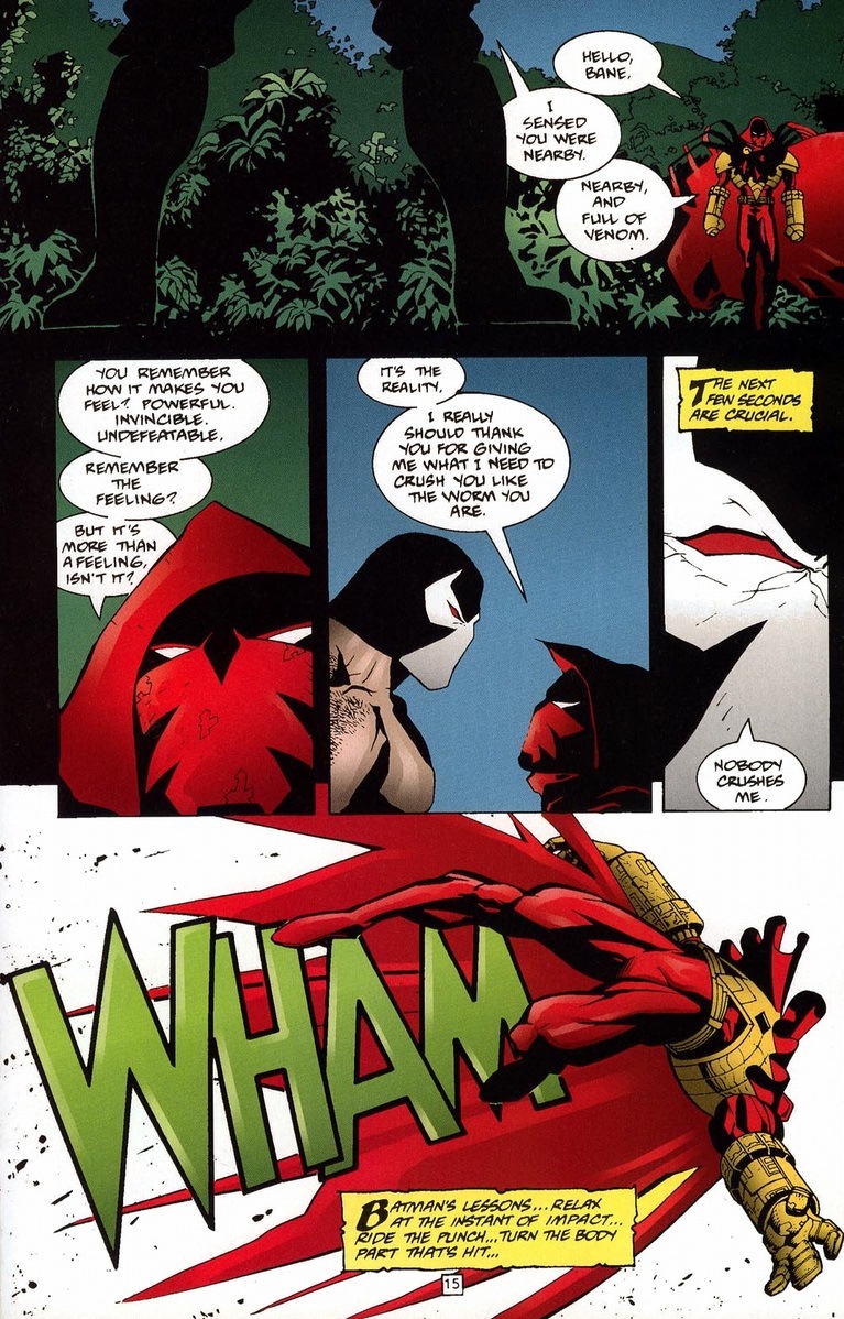 Azrael’s acting isn’t exactly Shakespearean quality, but why wouldn’t his gambit work the way it did? Bane’s weakness stems from his former reliance on venom, and without it, he’s physically weaker than when he fought Azrael’s Mecha-Batman suit. Though it should be known that Bane still massively overpowers Azrael. Any character in comic books who goes in combat without wearing a shirt is someone who’s pretty confident he (or she?) will splatter your butt across whatever tropical island/city block/space station/Microverse landscape you’re fighting in.