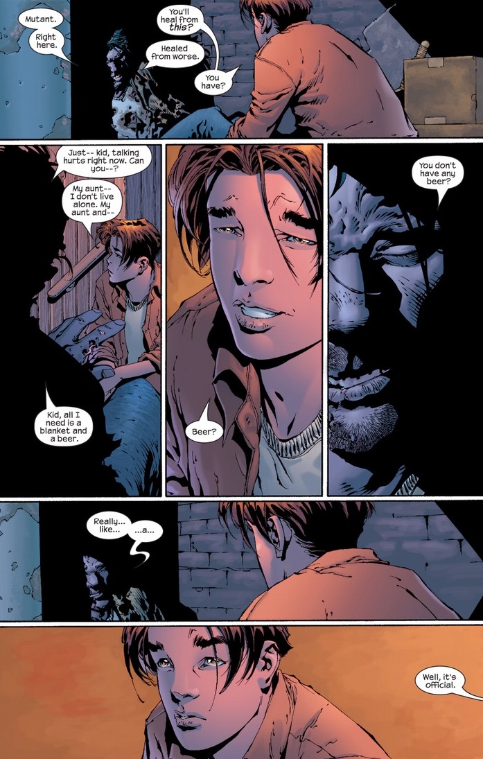 I get scared when I think I see a bug run across my carpet, much less the bloodcurdling fear I’d experience if I discover an unknown man hiding behind my boiler. Spider-Man has the right idea, screaming like a little girl, when he discovers this monstrosity bleeding all over his floor. Plus with Wolverine not being a threat, Spider-Man’s Spidey-sense didn’t activate, no doubt leaving a small amount of pee in Peter Parker’s underwear. Luckily, Wolverine explains the situation with all the verbosity and patience we’ve come to expect from the angriest and hairiest man who’s ever flirted with a teenage Jean Grey.