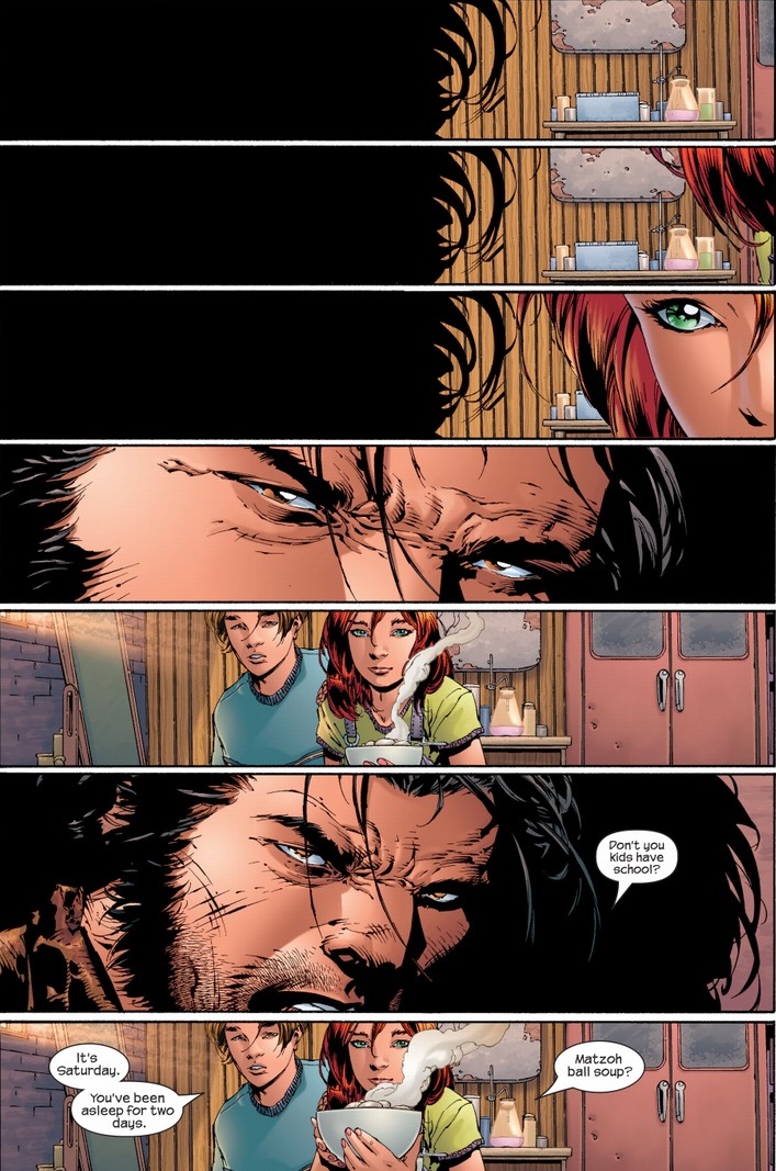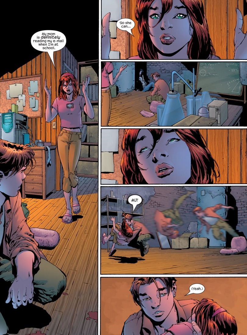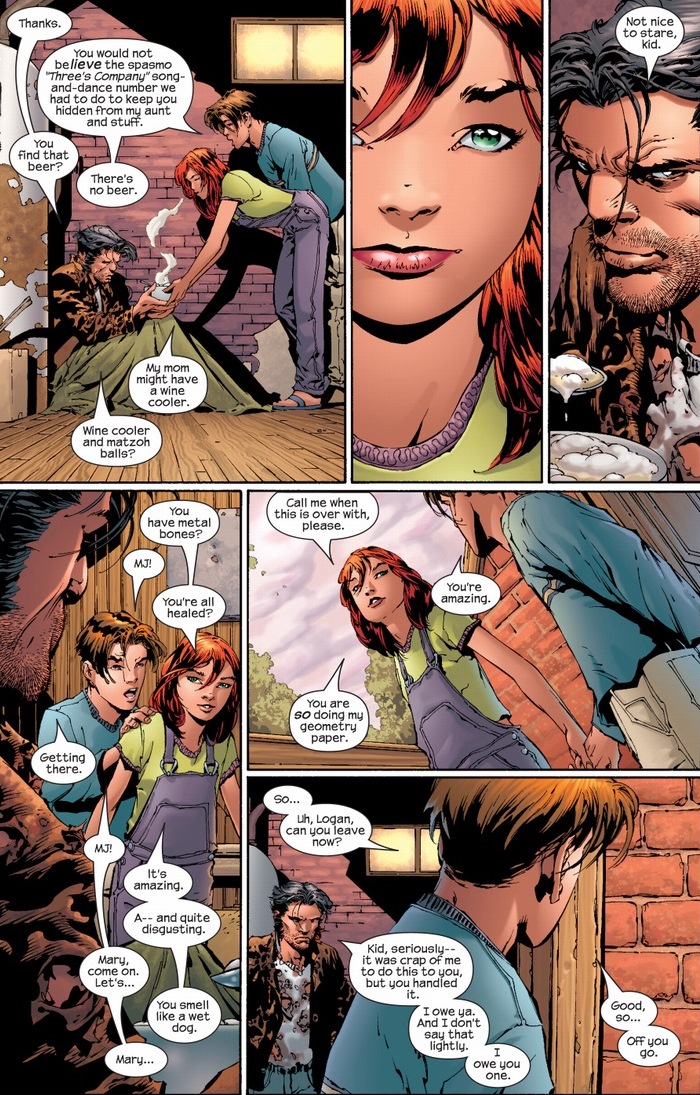 Let’s give Mary Jane Watson a break. She’s seen plenty of superheroes and supervillains up close by this point in her Ultimate Marvel universe life, but never the charred, bullet-ridden, almost-corpse of a half-yeti/half-man. Most importantly, she has to faint so Spider-Man can make that fantastic cinematic dive to catch her. Lucky for her, her lack of censorship when Wolverine wakes up makes up for a little of her fainting embarrassment. Also, she’s the only fifteen year-old to wear overalls who hasn’t just farmed for sixteen hours straight.