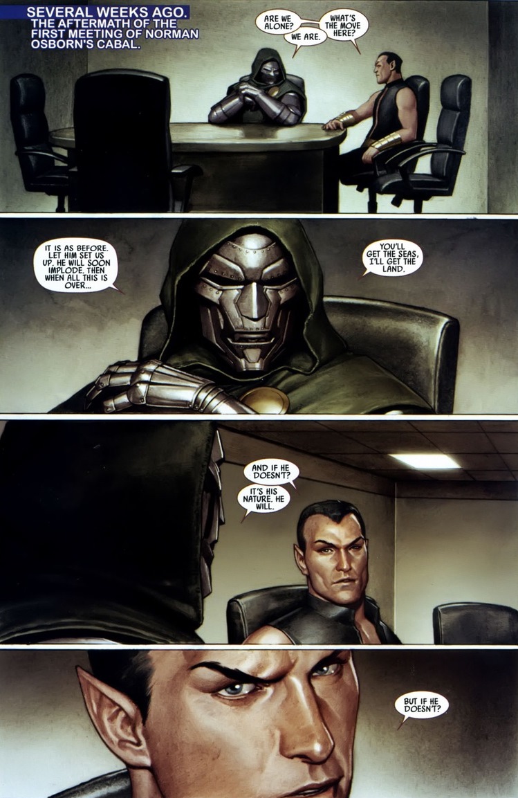 Anyway, Norman Osborn picked a secret “cabal” to help him rule the world and stuff — Emma Frost, Loki, Namor, Doctor Doom, and the Hood. Of those five, four end up betraying him, so y’know.