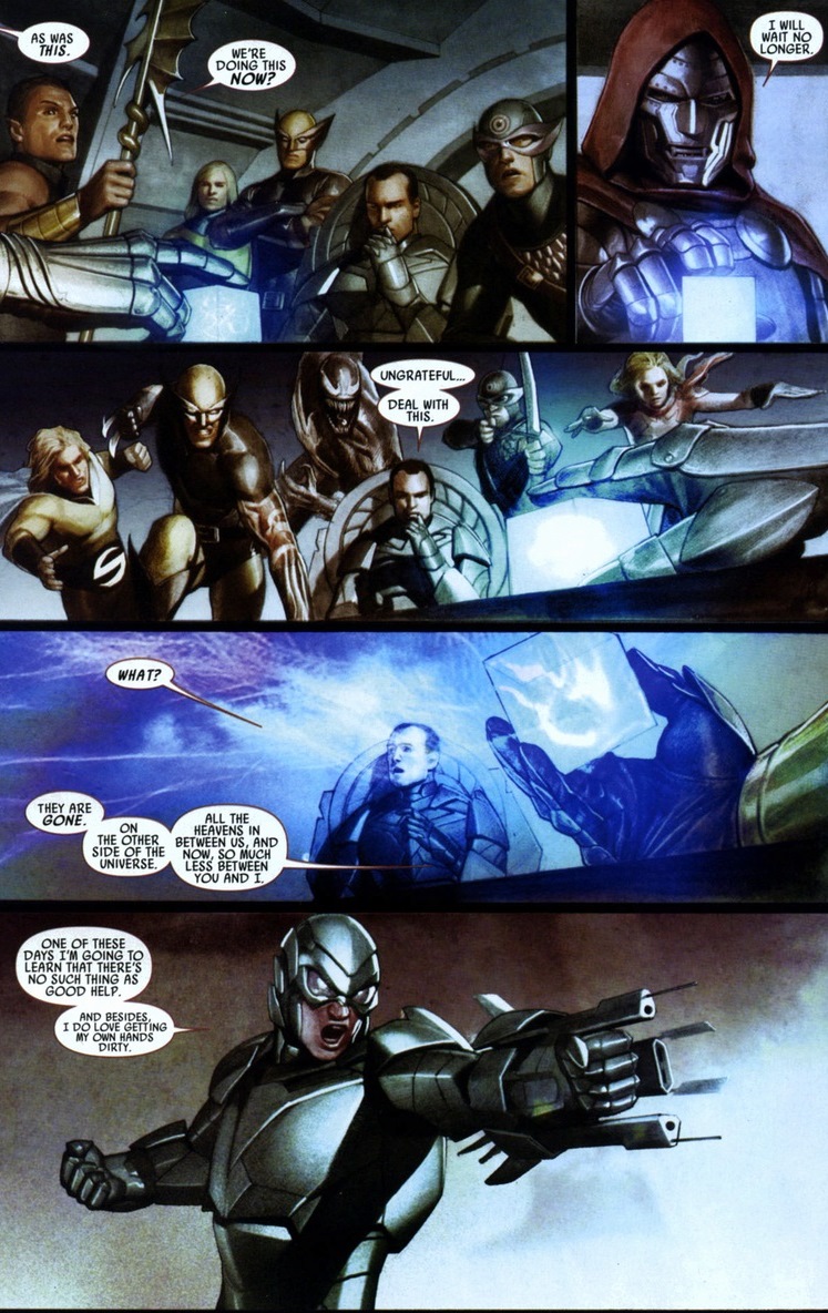 So Doom enslaved Emma Frost and (female) Loki, who I assume the latter can turn back into a dude anytime he feels like it. My only guess: Loki has a secret fetish. But look at the genius of this story: the blue shaded panels are all simply Doom daydreams, like we have when we’re staring at our computer screens at work. Under that mask still lies an adorable human mind, just really evil and stuff. Plus that whole naked Emma Frost and Loki thing? As weird as this sounds, it sort of humanizes Doom further to know he’s just as perverted as his other fellow supervillains, because I promise you, that’s all Namor daydreams about.