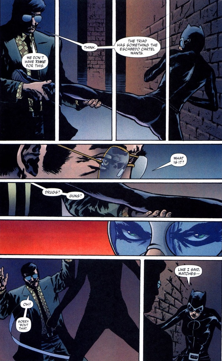 Catwoman attacks the Triads, who make the awful mistake of getting involved in the sex slave trade in Gotham’s East End (Catwoman’s territory). As talented and scary as Catwoman can be, she’s no Batman — she’ll need some help if she’s to take on an entire gang. Luckily, even with Catwoman’s egocentric rules, Batman’s always been a rule breaker.