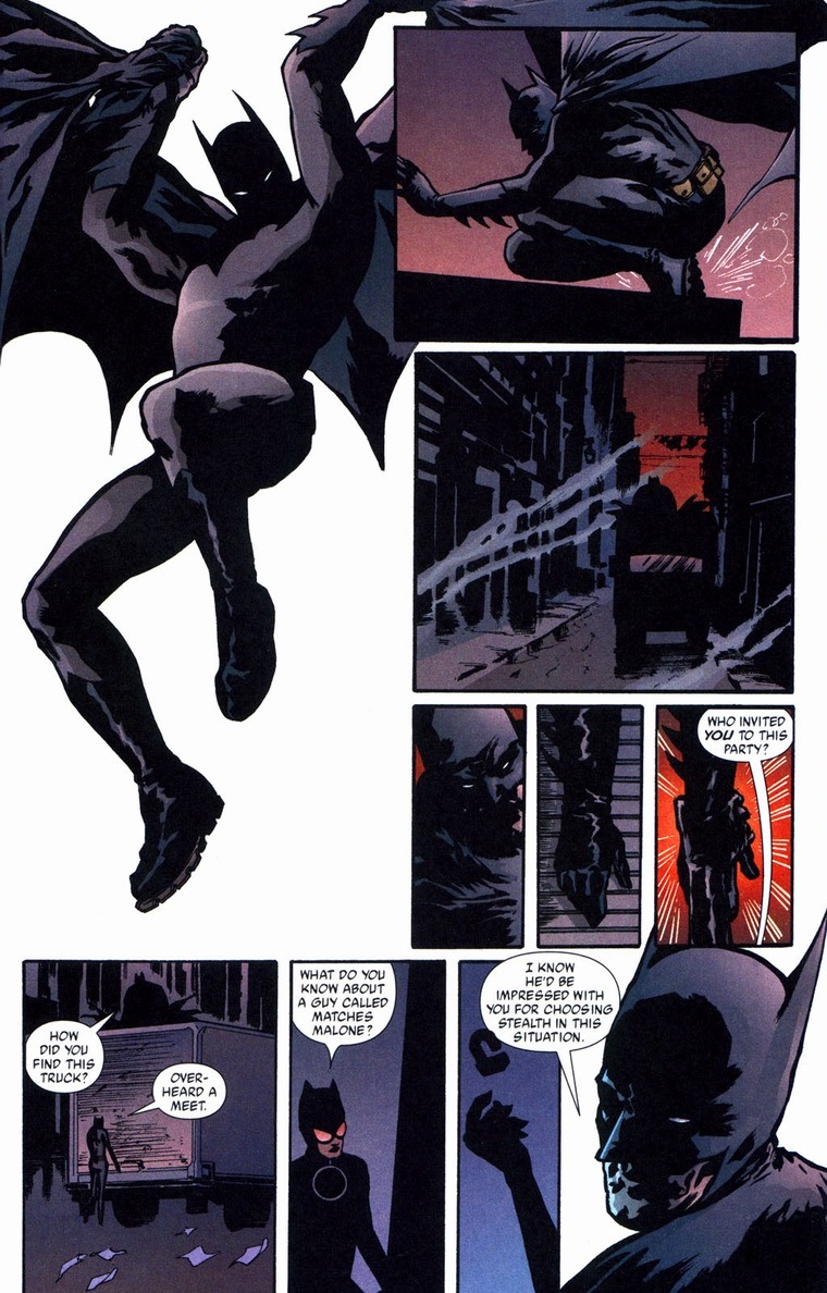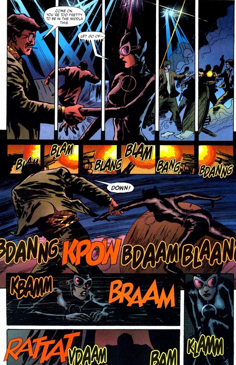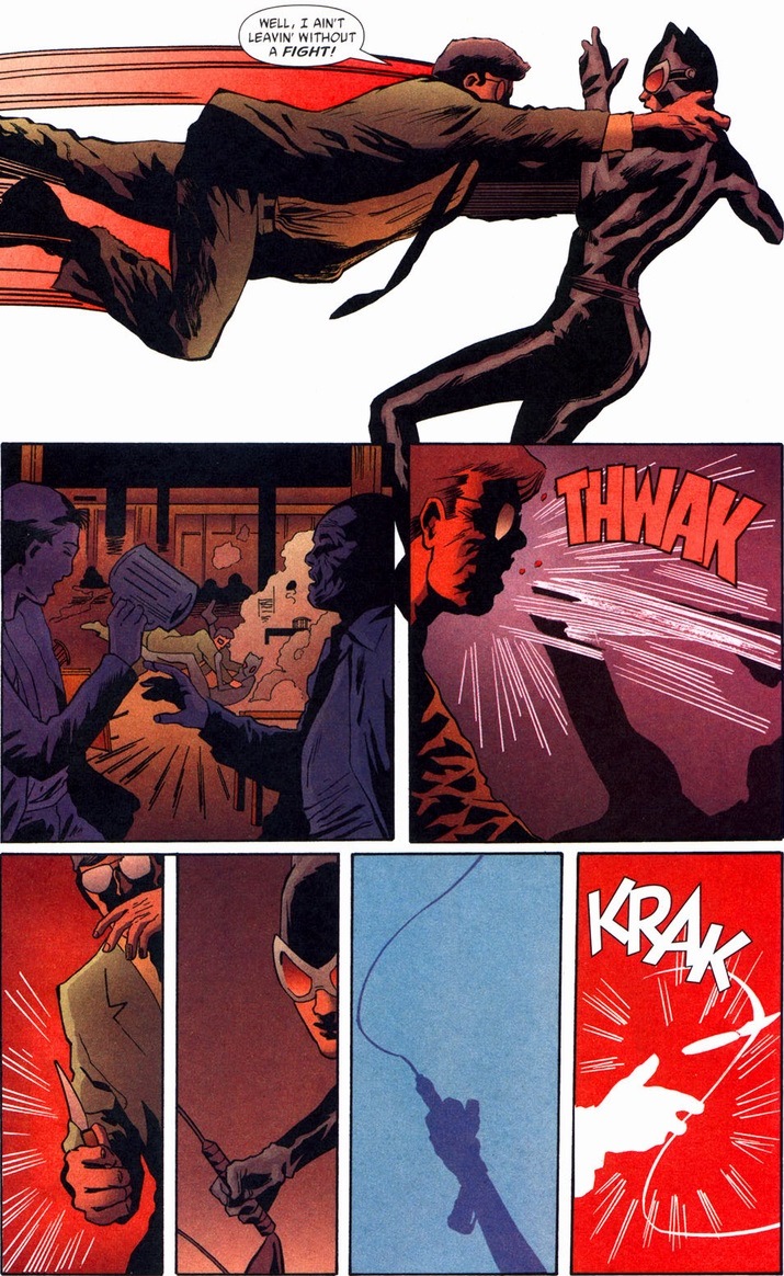 Thus begins a cat-and-mouse game where Matches Malone and Catwoman seemingly compete to see who can free the girls first, hence Catwoman’s rage like in the page below as she spends the next fifteen pages yelling at him and dodging gunfire to find these girls. See Matches Malone talking to the bad guys? What’s his real motive?