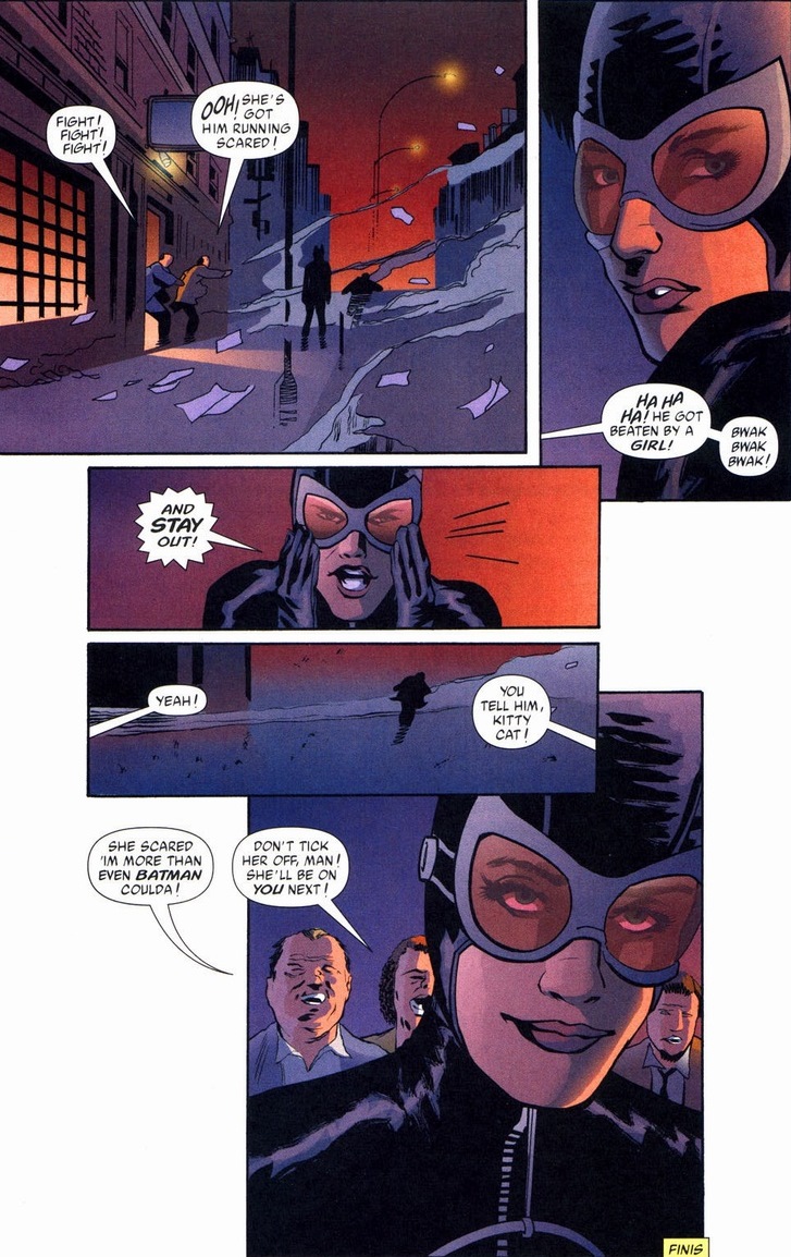 All that’s left is to solidify Matches Malone and Catwoman’s partnership. As in all that built-up anger (which pretty much drives Catwoman’s character at this point) towards our undercover agent has to get offloaded at some point, and we can see Batman be a delightful gentleman in having Catwoman being the one to squeak by with the victory here. Also, it saves him being randomly clawed in the face at some point in the next few days. Crime-fighting is a personality-walking tightrope. Especially for Batman, who has difficulty with stuff like feelings and friendships and stuff.