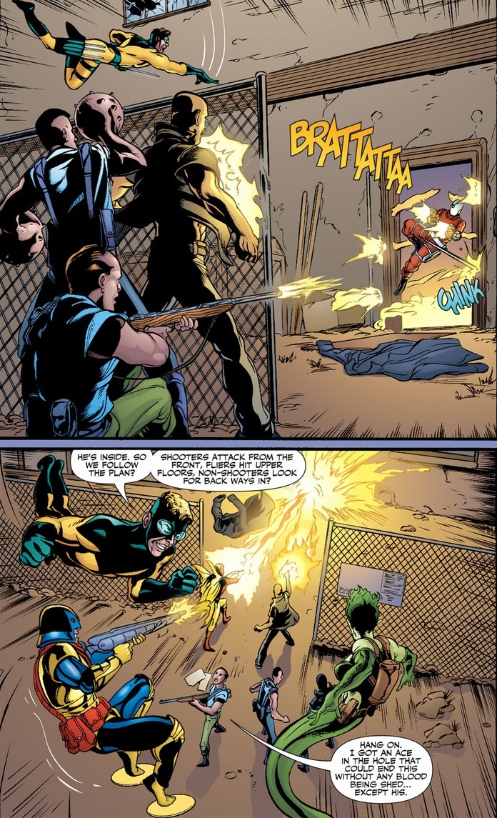 That’s right — in the comic book universe, good deeds always end up with a mob of supervillains ganging up on you.  Deadshot learns this the hard way.  So in Deadshot #5, volume two, written by Christos Gage and drawn by Steven Cummings, Deadshot gets to end his miniseries in a bang — and a fight against a dozen superpowered supervillains.  I know you’re not really sure who to cheer for — sure Deadshot’s the protagonist, but it’s not like you’d want the Joker or Lex Luthor or Gorilla Grodd to win if they received their own five issues.  Bad guys can’t win, because then the world would suck. But Deadshot got into this mess by wanting his illegitimate daughter and her former prostitute mother to live in a neighborhood free from crime and violence.  And that’s worth cheering for, right?