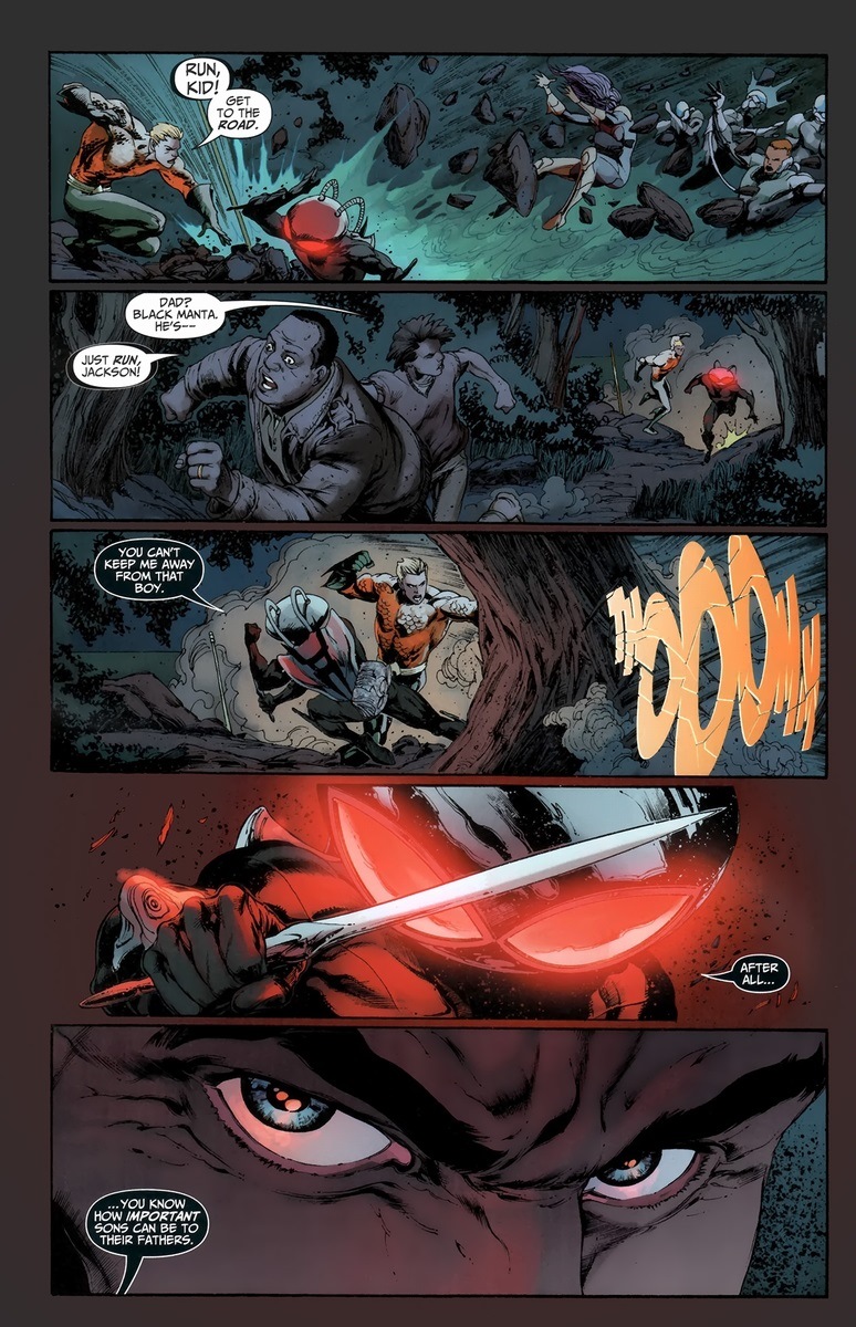 Kind of a spoiler, but I’m going to tell you anyway: Black Manta is Aqualad’s father. Much like other supervillains, he’s an awful father, always trying to kill his offspring and other bad-parent things. Unlike Aquaman, our new teenage superhero has powers more like Mera, which is the whole controlling water as opposed to the creatures that live in it. And to kill two birds with one stone, Black Manta’s suit gives him the normal super strength, durability, and a delightful horde of weapons to shoot at civilians. Oh, and a laser face mask. The basic stuff.