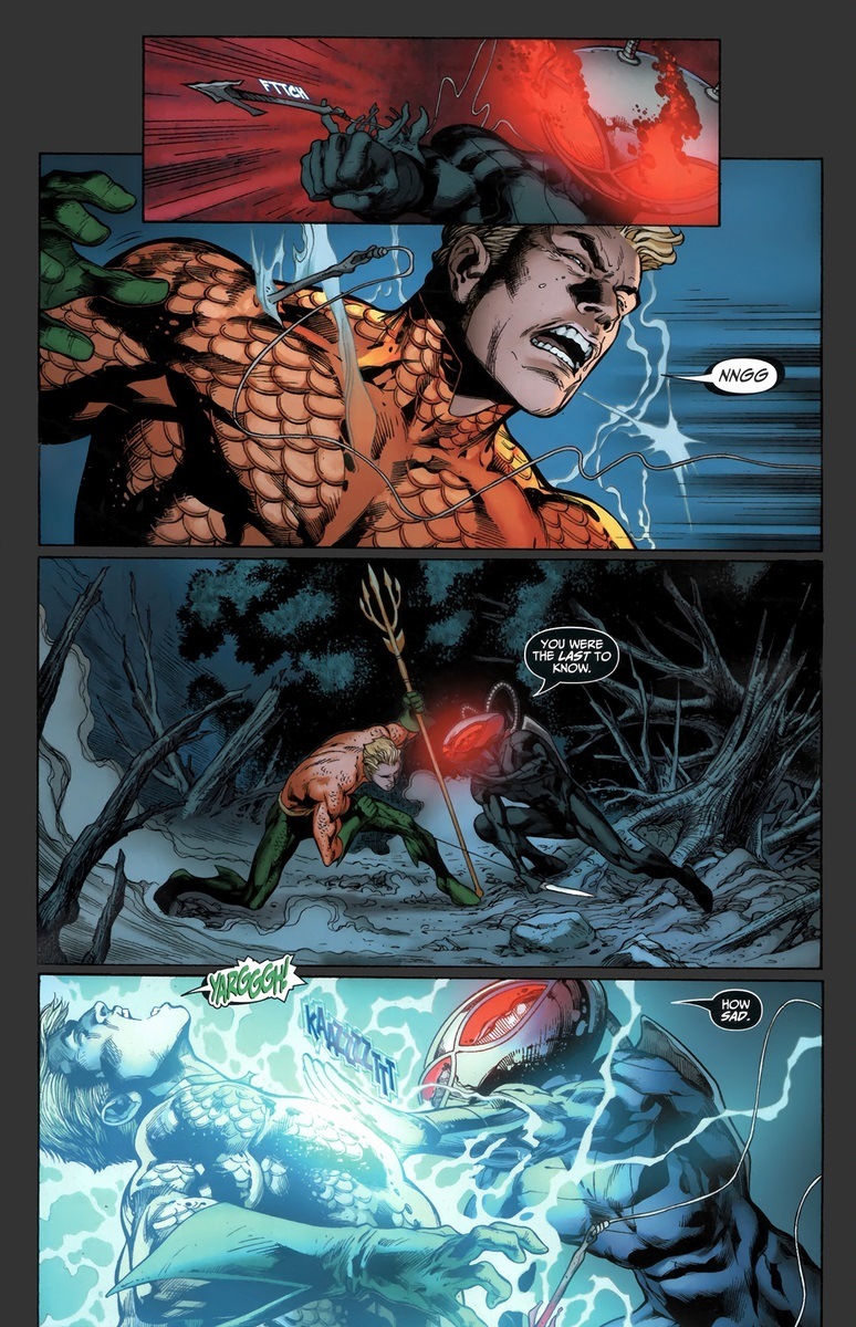 Posted: 12/07/2014 Filed under: DC, Fights 4 CommentsThe moments before the DC reboot were certainly bright. As in they had a series called Brightest Day that brought to life a bunch of dead characters just before the reboot made that unneccesary. Luckily for everything wet, Aquaman gets to be one of those fortunate few to come back from the dead. He died a few years before, it’s complicated, and I’m skipping that life (death?) event. But before he gets to do things like enjoy himself and be happy, he has a few loose ends to tie up. Like Black Manta in Brightest Day #10-11, written by Geoff Johns & Peter J. Tomasi and drawn by Ivan Reis, Scott Clark, Patrick Gleason, & Joe Prado.