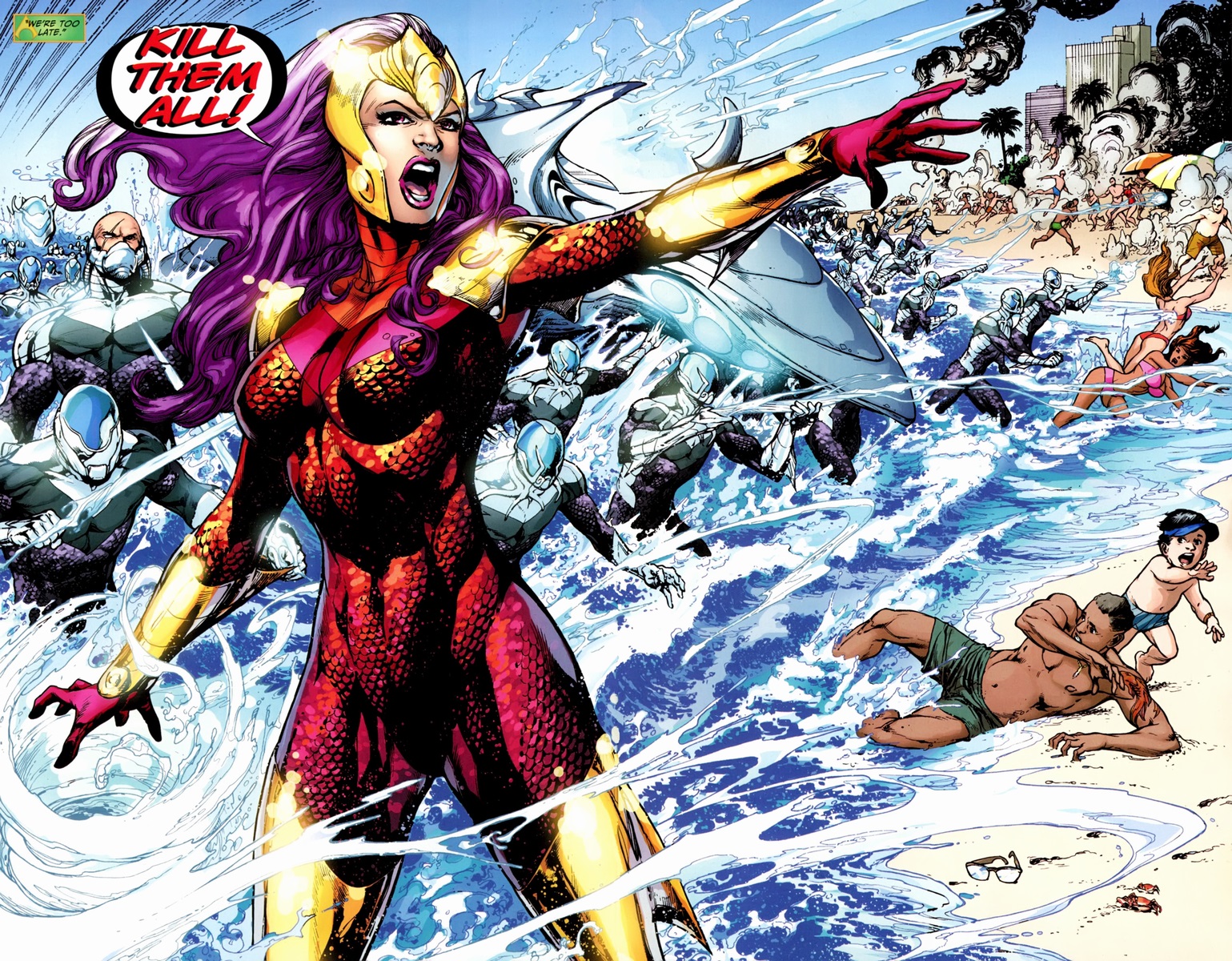 Notice how the mean lady looks similar to Mera? Meet Siren, Mera’s younger sister. They both come from the alien ocean world of Xebel, who wants to kill Aquaman for illegal riding whales or something. Look, I don’t do as much research as I should. What’s important is Aquaman and Aqualad stand alone against an army of bad guys.