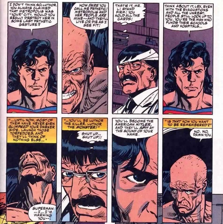 Despite Superman’s obvious argument, the assistant still launches the missiles and destroys Metropolis, Lex’s legacy, and everything else associated with Lexcorp. But remember when Superman could stop Lex Luthor from destroying entire cities by reminding him that killing millions of people would hurt his reputation? I’m fascinated with this scene, as it brilliantly showcases Lex’s incredible complexity – he wears a secret identity of the philanthropic businessman while his real hidden supervillain identity seeks to maim and destroy the same ideals he holds up in public. Similar to Superman, Batman, and the entire roster of DC superheroes, Lex also wears a mask. We get it, the Joker doesn’t care about insignificant stuff like likability, but Lex operating on two fronts makes his motivations and actions far tougher to predict when the big schemes get actualized. Like say, maybe he won’t level Metropolis to become the American Hitler, but what about a giant purple robot wrecking the city in a weird Gundam Stephen Hawking combo? Also, you can always click a picture to see a larger version of it.