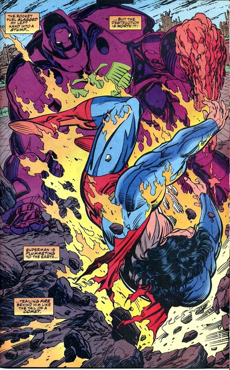 As Lex’s final act in his failed-clone body, he uses a mech to light Superman on fire. A fantastic way to go out, despite Superman pretty much being immune to fire. Do you see the destroyed city behind them? Lex blames Superman for forcing his hand. If only the Man of Steel hadn’t interfered in Lex Luthor’s evil plans, then the missiles would still be happily in their silos. Because Lex is a sociopath, of course. The terminal cancer, the love of Supergirl, the decaying body – everything he did to undo that was because of his own hand. Literally, because the kryptonite ring on his finger began the slope into tatters in the first place. Don’t feel bad for dear Lex, because if comics books have at least one silver linings in their convoluted universes, bad things will happen to bad people.