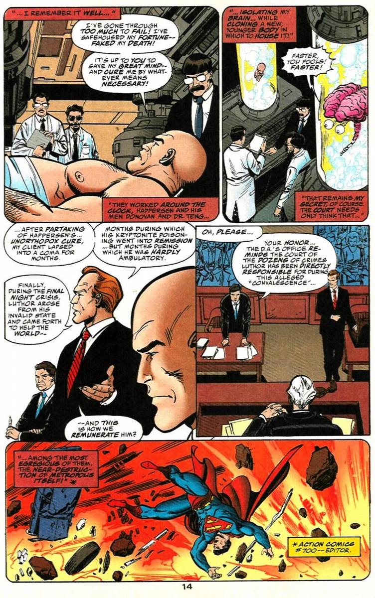 Luthor’s defense consists pretty much entirely of lying their balls off.  But you’re not reading comics for long-winded arguments about legality and whatever, you want the theatrics.  You want the moments where the lawyers slam their hands on the table and the crowd gasps in shock.  You want a piece of evidence or surprise witness thrown into this courtroom that blows the pants off everyone who reads the comic.  Also, you should probably go re-play all the Phoenix Wright games. Look, Luthor comes out of this spectacularly, but his most important restoration isn’t his body or his corporation or his secret villainy – it’s his ego.  There’s no containing that monster anymore.