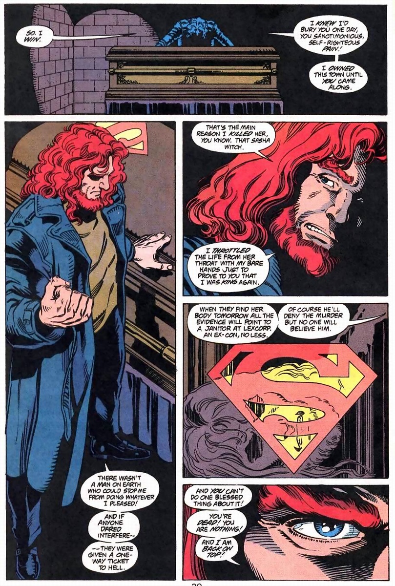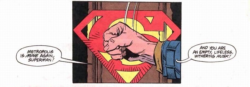 In a twist you most likely figured out last article, Lex Luthor II is actually Lex Luthor I in a cloned body. We should have always known by the prominently excessive head of hair – when one can remake one’s physical attributes, a bald man will always opt for hair. Don’t let any bald guy lie and tell you otherwise. The original body gets thrown into a dumpster or whatever, meaning that from 1992 until the reboot in 2011, that Lex Luthor you’ve been seeing is a clone with Lex’s brain put in. But with the big reveal behind us, Lex Luthor can go back to being a jerk (secretly for now, though) – he chokes a woman to death a few pages before the ones below just because he can. And what terrible timing too, as Superman just died. Doomsday punched him to death. Here’s Lex’s megalomania-induced eulogy: