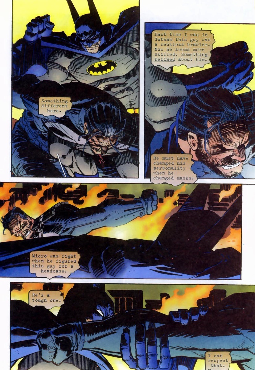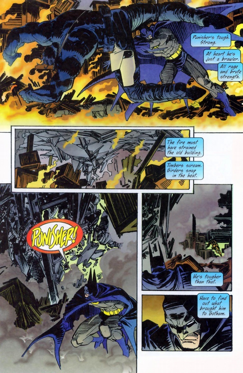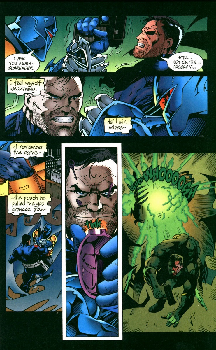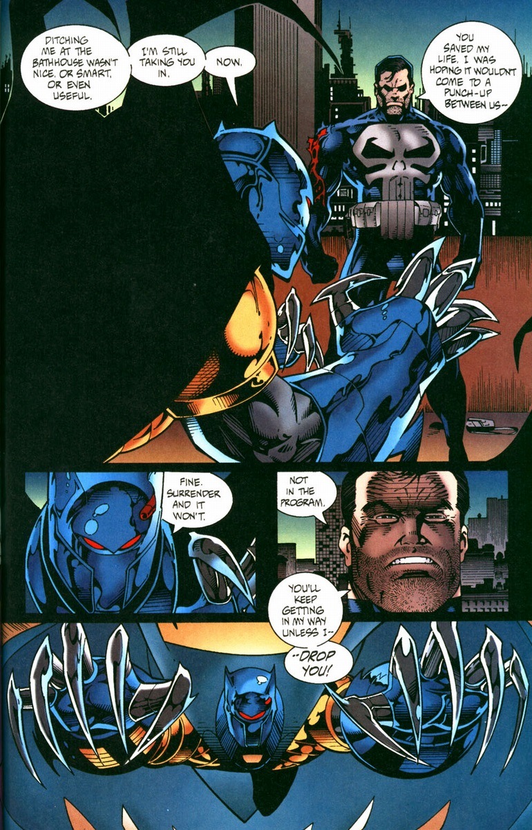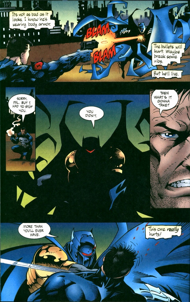 Batman and Punisher, each not fond of the other, get two short fights. It’s bound to happen, y’know, because the Punisher shoots people once while Batman prefers instead to have bad guys get jump kicked over and over again for decades. More importantly, without all of Azrael’s armor and claws, we’re going to get a fair fight – at least as fair a fight from two fictional characters each with rabid, loyal fan bases who’ll rise up against the opposite comic book company if their boy loses.