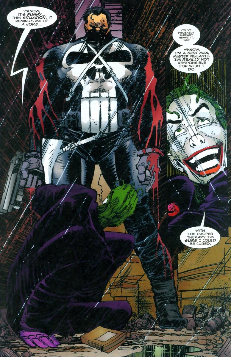 You’re about to witness a punch so full of rage and frustration that it needed a two-page spread. But rest easy knowing that you and the Punisher likely have the same opinion of Gotham City: it’s an insane, illogical, mess of a widly broken city filled the most insane, illogical, and definitely broken people. Plus, in New York City, superheroes dress as spiders instead of bats, the way a civilized society should be.