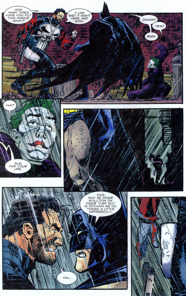 Look, let’s be honest: the Punisher has probably saved far more lives than Batman has. Not in terms of catching civilians from burning buildings, but just in the sheer thousands of mobsters and criminals the Punisher has taken off the street. And it is in the thousands. Every issue he mows down at least one crowded restaurant or party full of bad guys. So with the climax of the book over complete, and all Punisher has to do is clean up whatever trash remains – you know what’s going to happen in the next three pages as soon as you take a look at the first. Of course Batman’s not going to let Punisher kill Joker, and of course it’s done in a very non-Batman way, but what else could possibly happen? The end result always ends with the status quo. That’s good business.