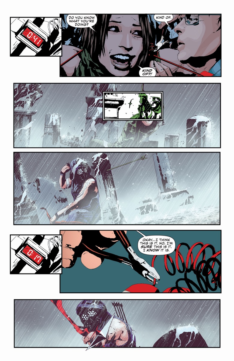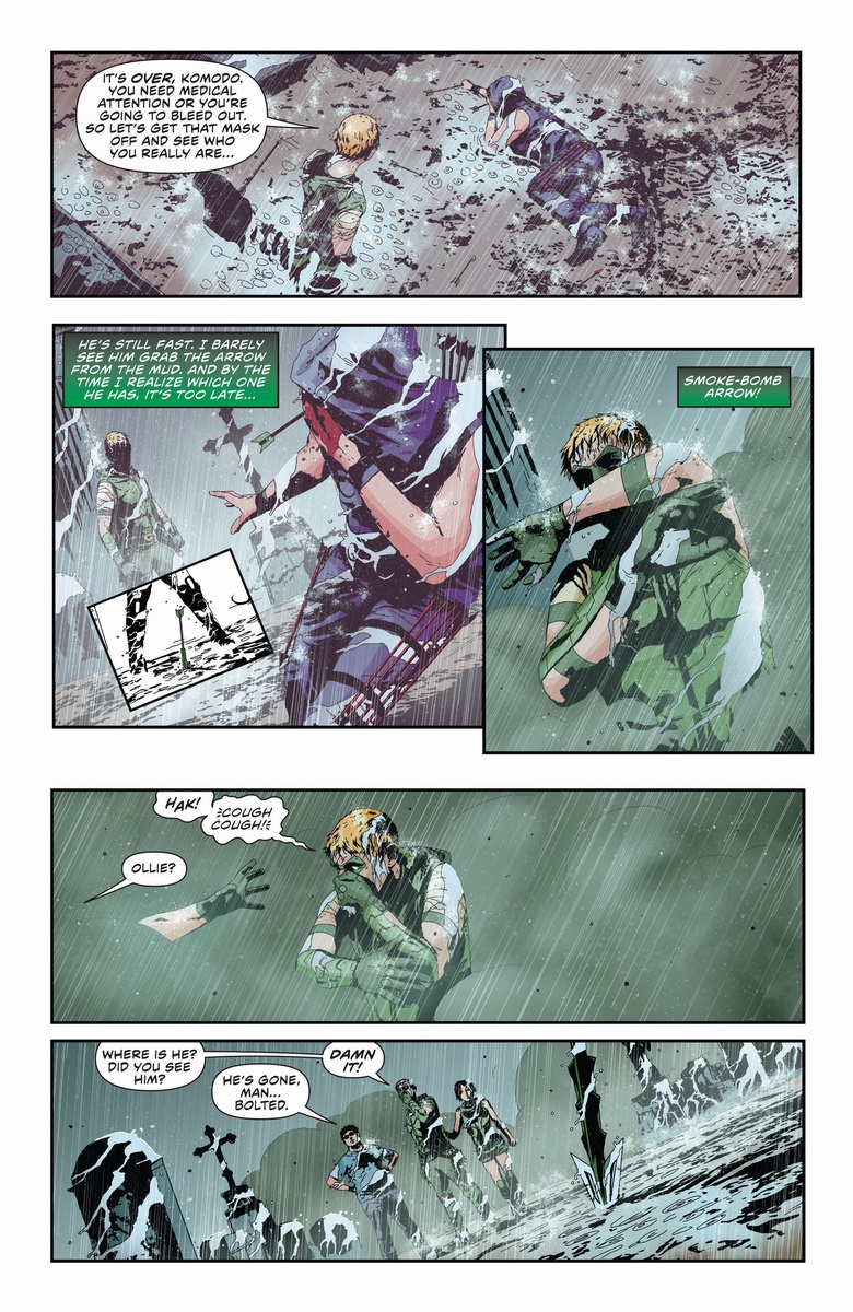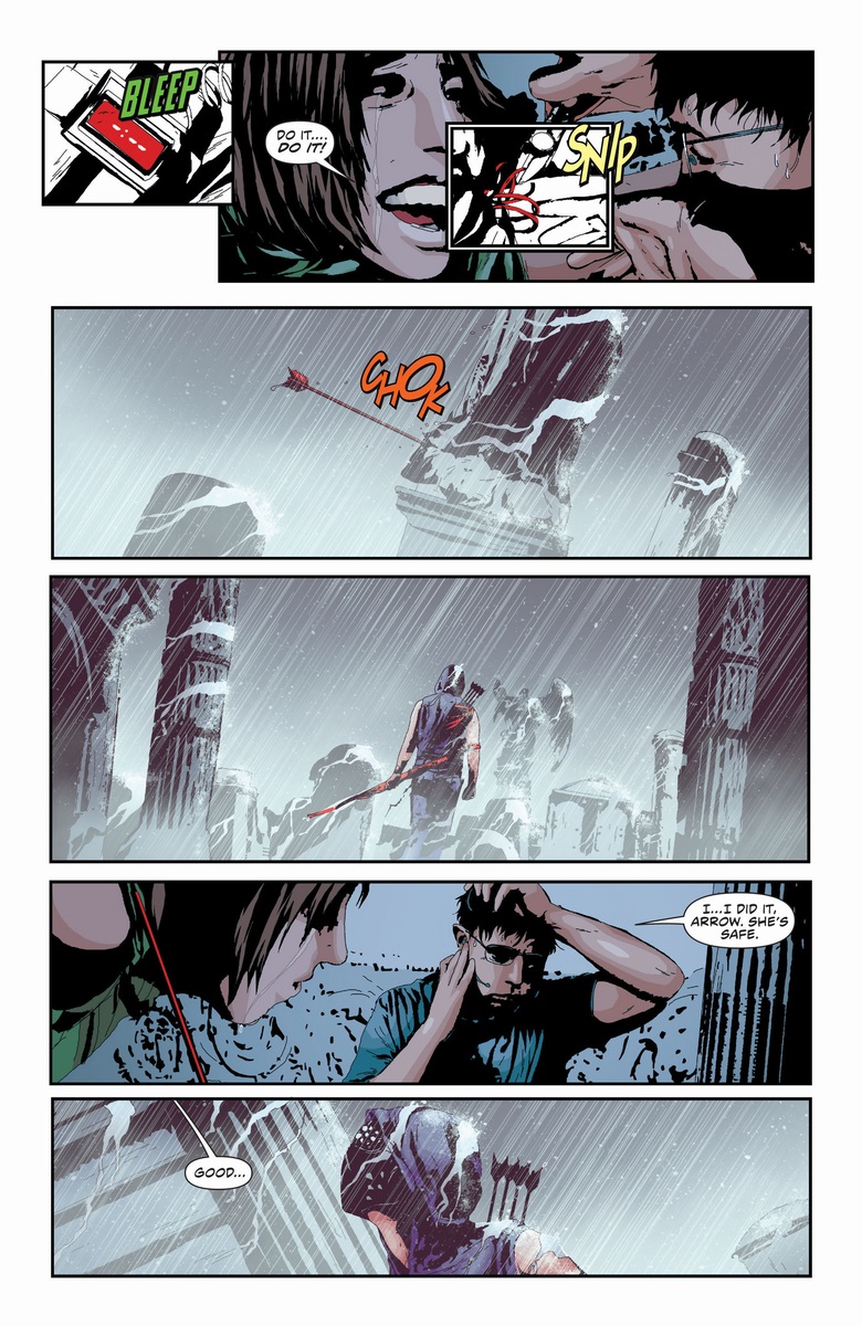 Superheroes gain an unfair literary advantage in the rain. Since rain always symbolizes hopelessness or depression or frustration, our superheroes automatically enter the battlefield coated in the gloomy downside of a hopeless, depressive, or frustrated fight. So of course good triumphs over evil. The more “dark” the setting, the more victorious our superheroes’ actions become. When Green Arrow takes down Komodo with an arrow in the eye (which isn’t a spoiler as you can clearly see it below), oh, how powerful the moment becomes. It feels good. Good rocks, evil sucks.