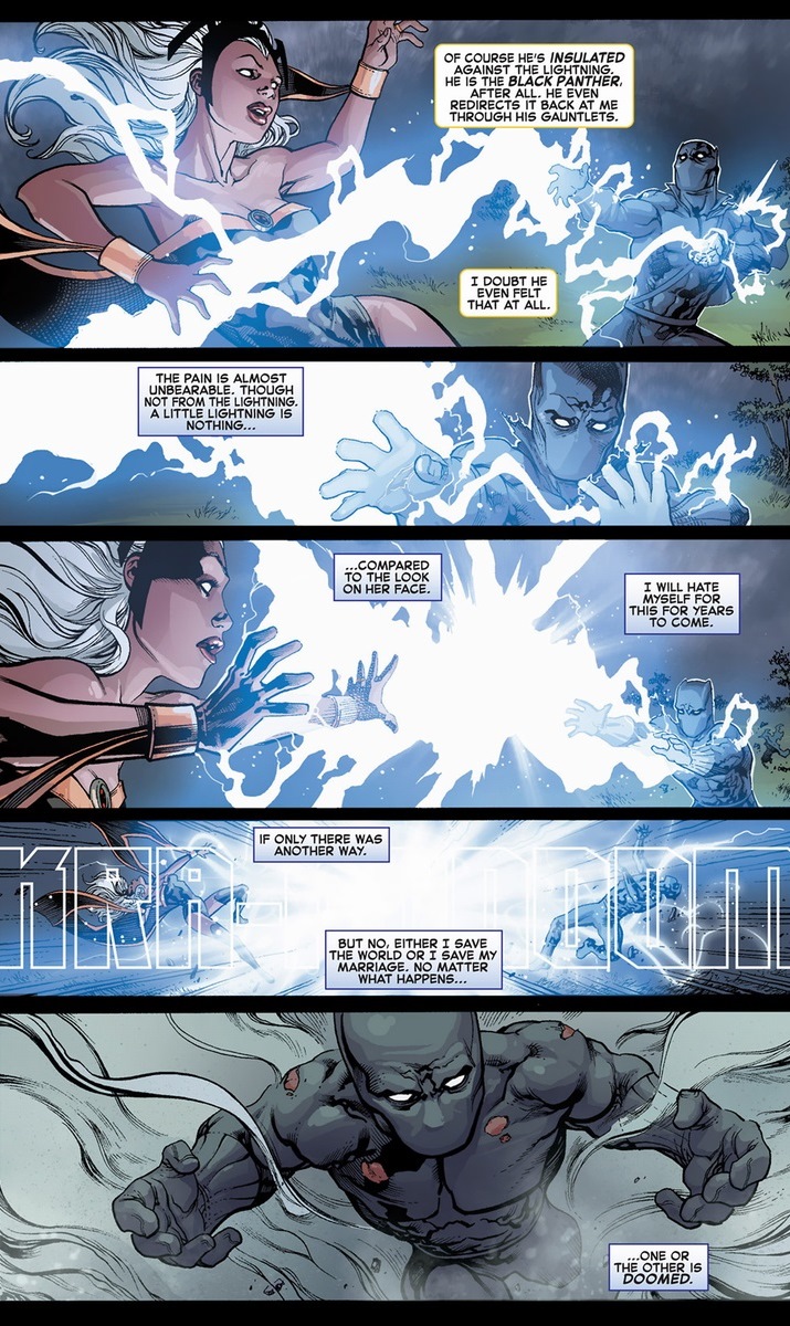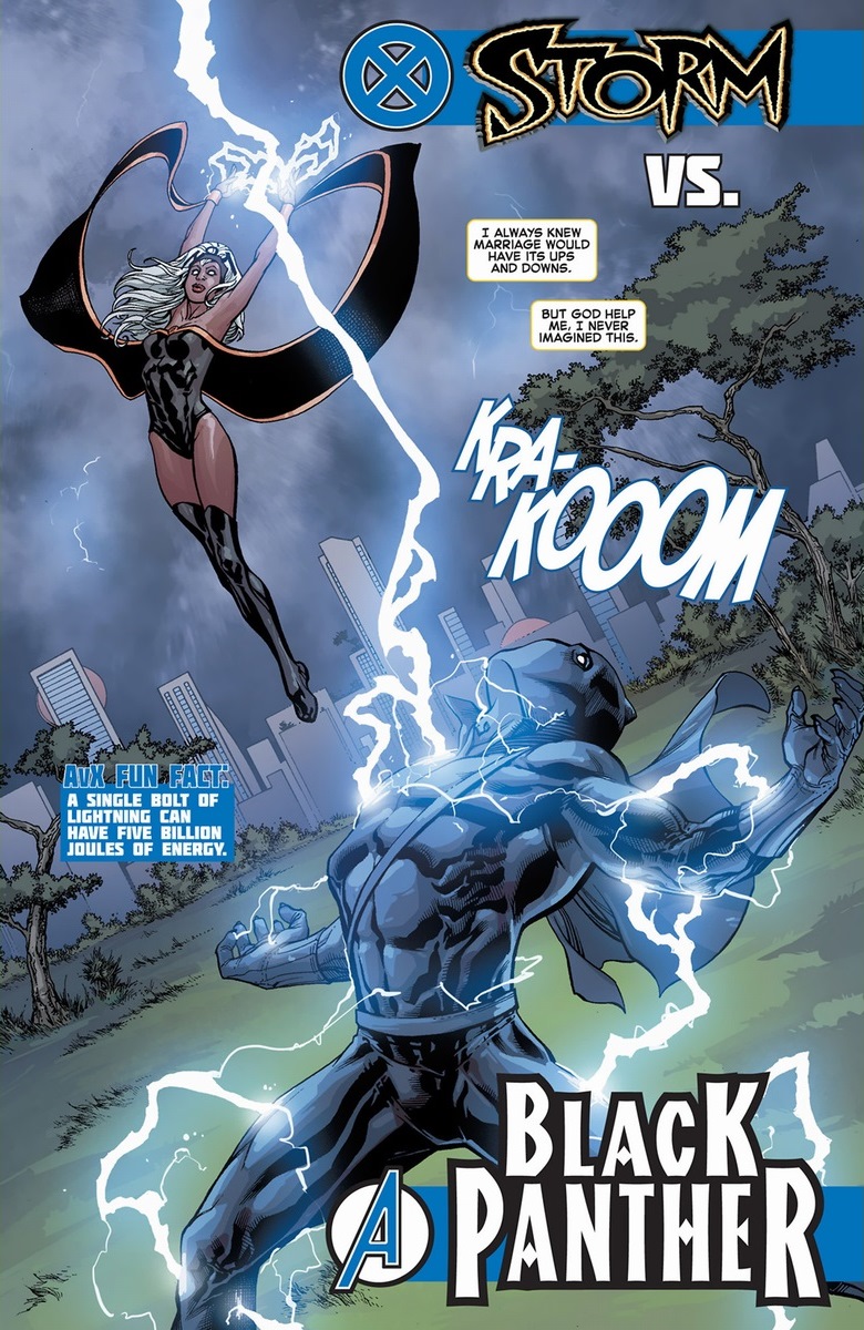 If you didn’t read Avengers vs. X-Men, Black Panther ended their marriage halfway through the event. I’ll cover it soon. So, you can imagine that while lightning strikes and right hooks certainly cause pain, that emotional scarring remains fresh and bleeding. The two can parry jabs and kicks, but they can’t dodge the kung fu chops to their hearts. Yet justifying their break up could certainly add some delayed armor before the inevitable tearful breakdown/rebound sex with Wolverine. Storm, not Black Panther.