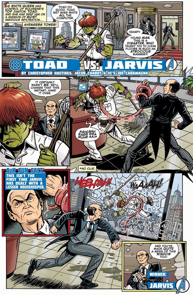 Thor, the Superman-with-a-hammer, faces Emma Frost wielding that neato Phoenix Force. Y’see, the benefit of having God powers is that the writer can really make Emma Frost do whatever the writer wants to, because her enhanced powers haven’t been established like Thor’s have. Plus, her outfit is even more revealing than her normal revealing outfit. Really, the battle here lies between their egos.