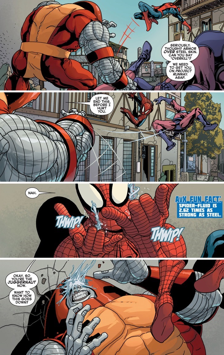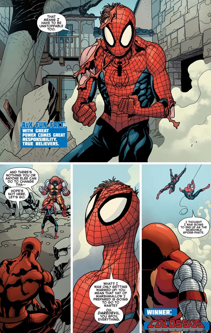 But can this unbeatable force take on the most lovable of the Avengers? Can Colossus defeat my personal hero and inspiration to preteens everywhere? Oh my goodness, yes, Spider-Man doesn’t stand a chance.