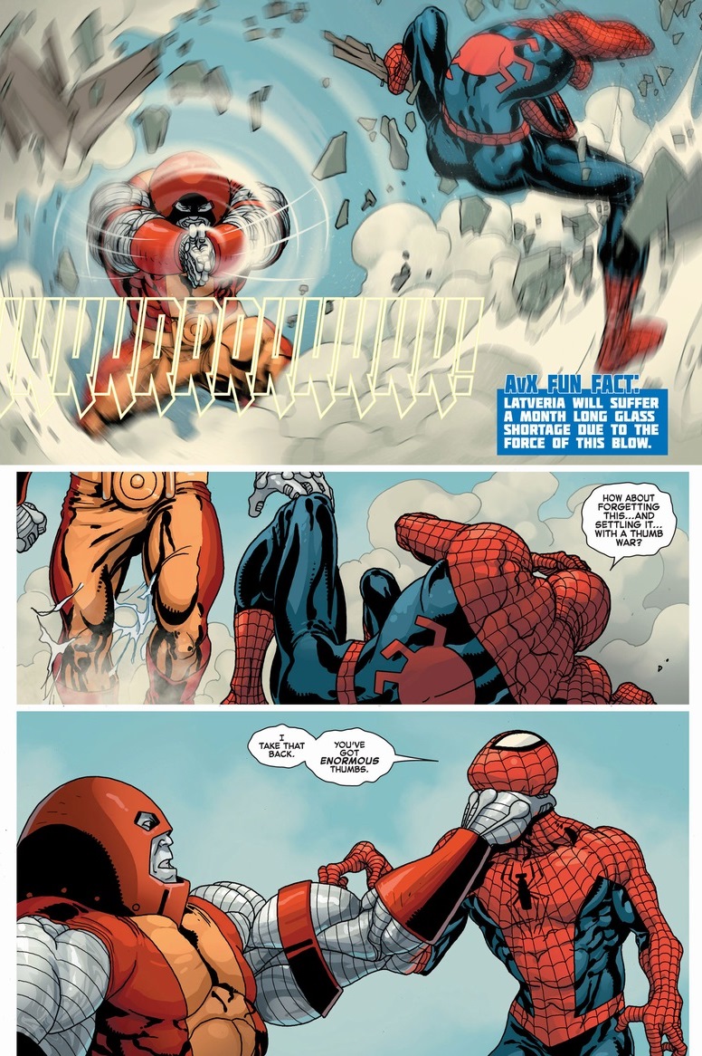 Posted: 09/29/2013 Filed under: Fights, Marvel 5 CommentsI love dramatic character development and beautifully executed suspense as much as the next reader, but let’s be fair — if superheroes talked out their problems instead of punching them, we’d be far less inclined to read. Look, I want Hulk to be happy, but I also want him to rip a moon in half. Today, you get just the violence — none of that pesky plot nonsense. We’ll get back to stories that touch our hearts and souls on Wednesday. In AVX: Versus #4, written and drawn by Kaare Andrews, as well as AVX: Versus #5, written by Jason Aaron and drawn by Tom Raney, let’s not waste any of your precious time.