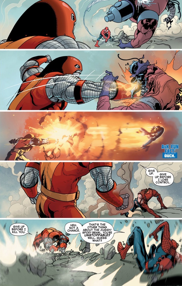 We’ve discussed Spider-Man’s strength level before — he can lift roughly ten tons, which won’t be anywhere near enough to even dent the Russian monster. Think of Peter Parker as a fly constantly buzzing in Colossus’ ear. Yes, the fly’s annoying and frustrating, but you really don’t want to squish it if you don’t have to. Still, persistence only leads to trouble and flies tend to be dumb. Poor foreshadowing for Spider-Man.