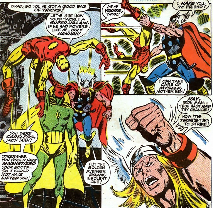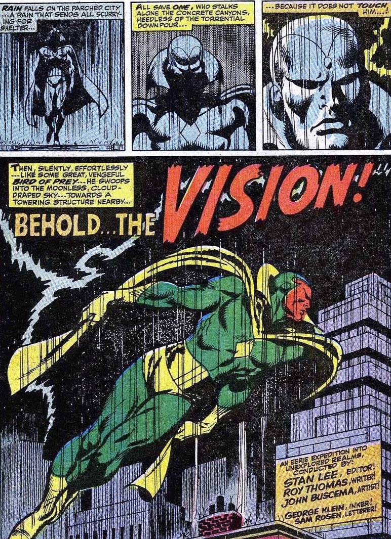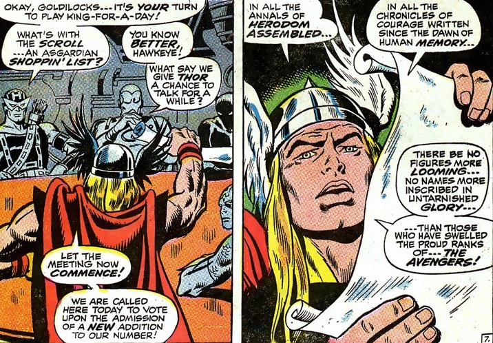 Posted: 10/27/2013 Filed under: Characters, Marvel Leave a commentOne more won’t hurt, right? Besides, it’ll serve as a fantastic contrast to how comics have evolved as a medium over the past fifty years. I’m not here to argue whether the changes have been for the better or worse (definitely better), but this’ll be a fantastic lesson if you’re not caught up on the beginnings of the Marvel universe (everyone under 35?). Today as we explore #14 on Comic Book Resources’ Top 70 Most Iconic Marvel Panels of All-Time — the full list available here — don’t be afraid to read closely. The dialogue’ll sound cheesy, the plot silly, and the action brief, but The Avengers #57-58, written by Roy Thomas and drawn by John Buscema, is a perfect example of 1960s Marvel comics. Plus it contains this fantastic (and iconic) panel: