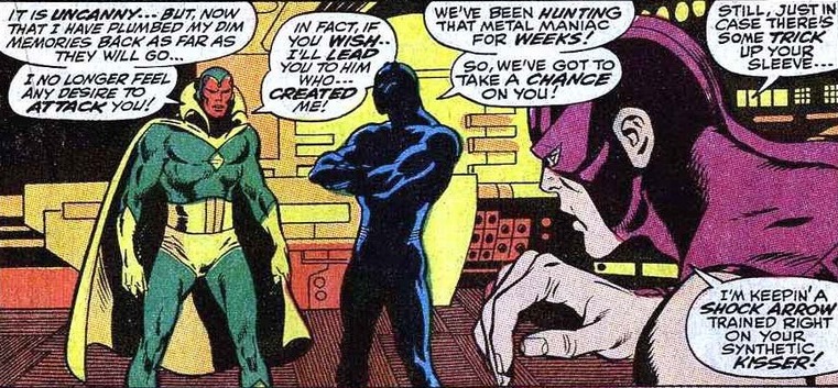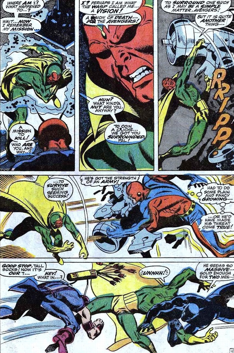 Well, not for long. Vision’s father/creator Ultron put some sort of empathy chip or something, because the Vision only needs ten pages to go from unrelenting evil to pushover good guy.