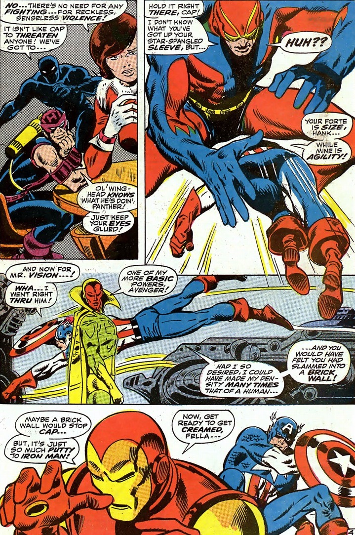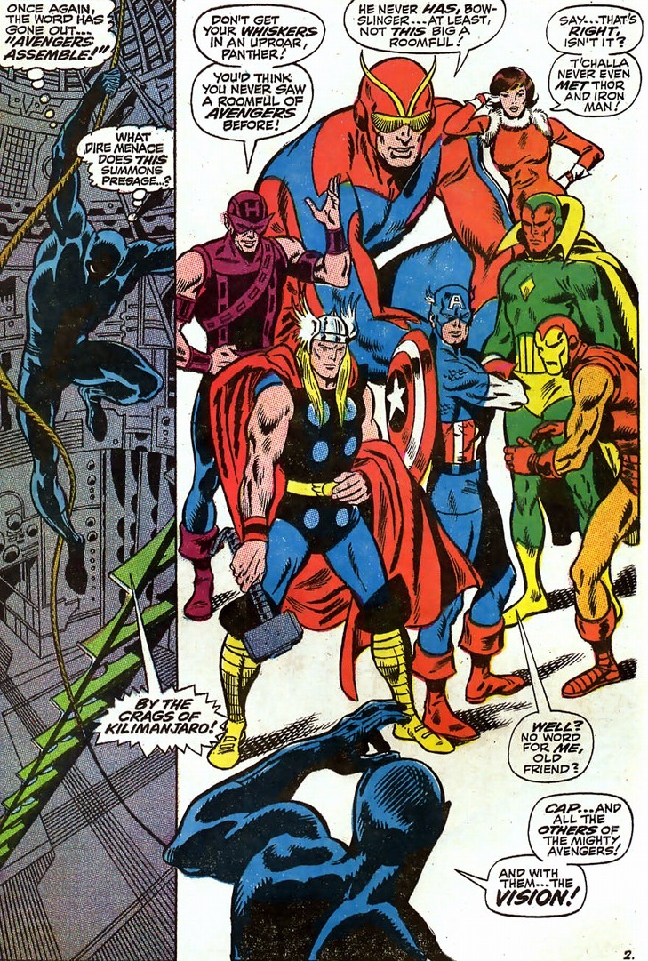 I can’t tell if Black Panther shouting “By the crags of Kilimanjaro!” is racist. Probably not, but I miss the era of catchphrases and meaningless outbursts. Luke Cage’s “Sweet Christmas!” Dr. Strange’s “By the hoary hosts of Hoggoth!” Beast’s “Oh my stars and garters!” At least The Thing still works his into every other issue or so, even if no one currently going through puberty knows what the word clobberin’ means. Oh, and Vision wants to become an Avenger: