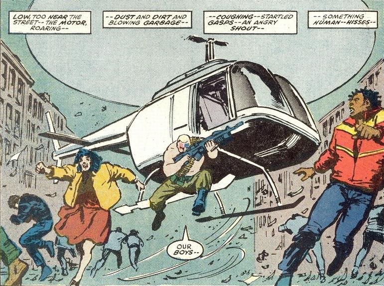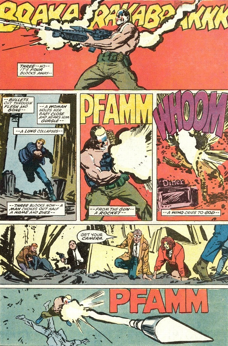 Nuke’s a super soldier serum reject. So he has Captain America’s abilities plus all those cybernetic enhancements and a heavy dose of supervillain crazy. Daredevil eventually emerges victorious which I’m skipping (though you should buy the book for the importance of the story in Marvel’s history anyway), and even shoots down a helicopter. Batman may not use a gun, but Daredevil’s principles tend to be a bit more lax when his borough blows up.