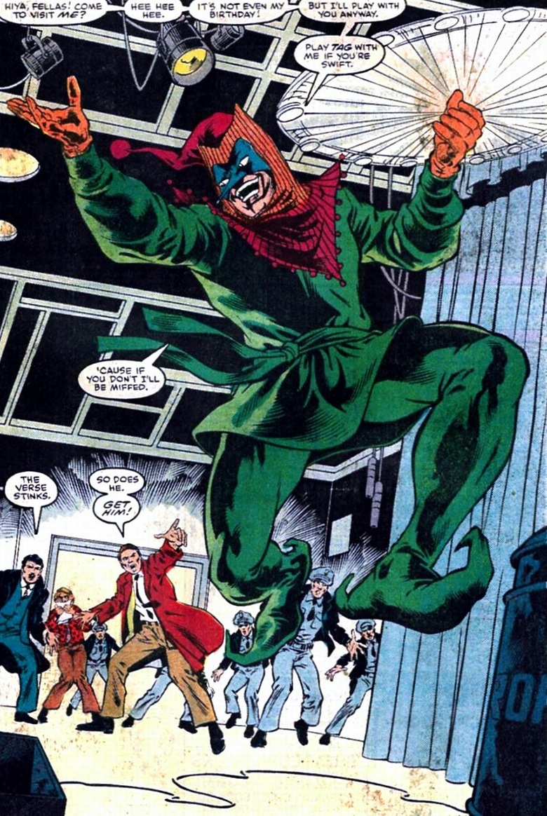 Notice the cool noir-style text boxes? Y’see, the problem with committing crimes among a world inhabited by superheroes with secret identities is that they could be disguised as anything, like say a stranger wearing a fashionable peaked cap and leather jacket.