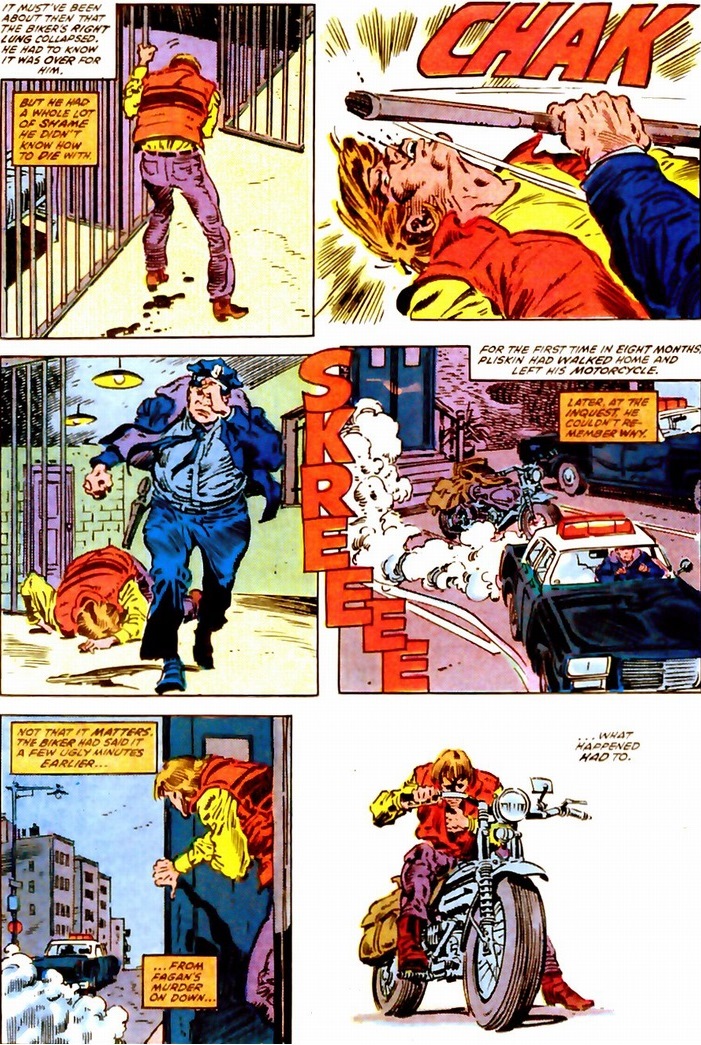 My favorite line so far: “Then in he came, like he was born with a gun pointing in his face.” If we ignore Murdock’s blindness, he still jump kicks dudes shooting bazookas and miniguns almost nightly. Of course a punk with a pistol won’t even register a single bead of sweat. That and he’s the Man Without Fear. But mainly the first reason.
