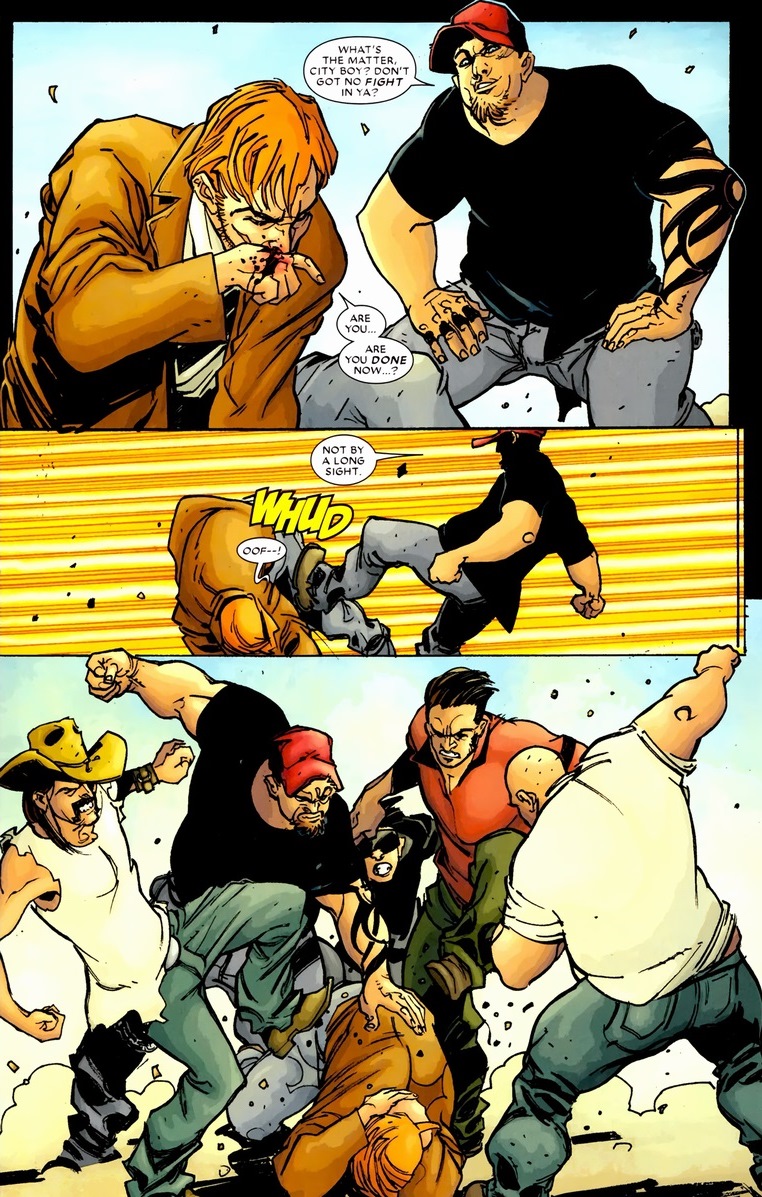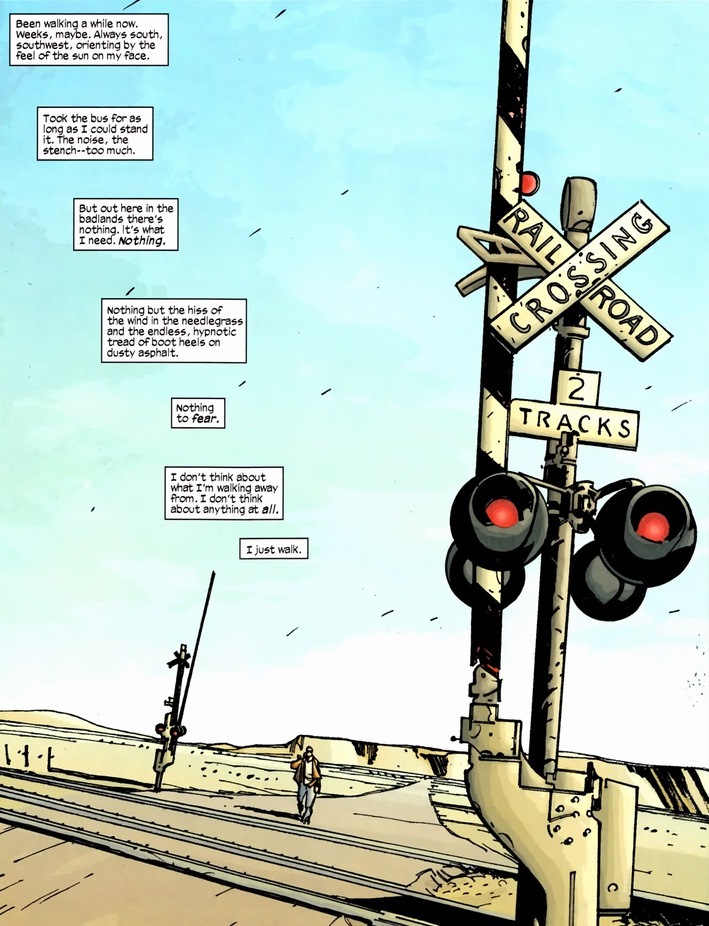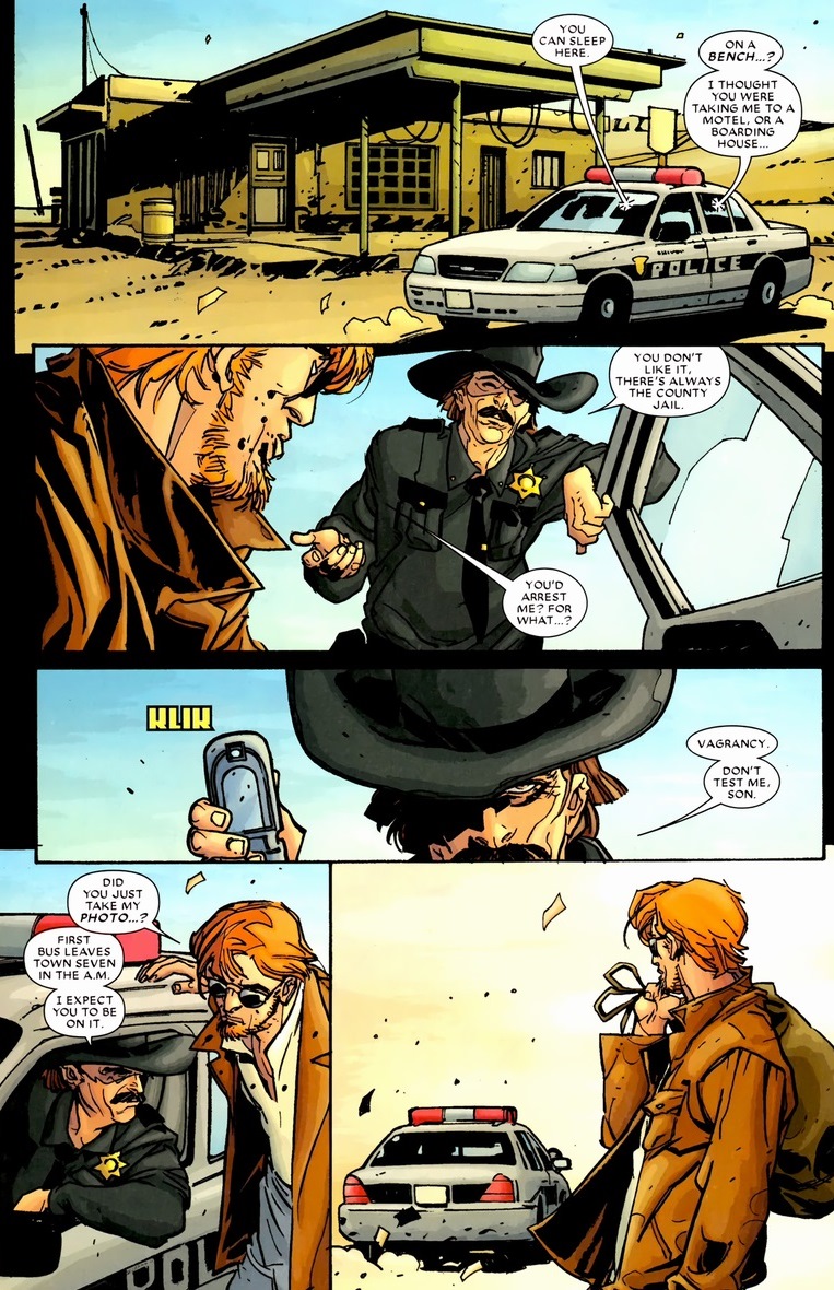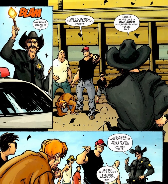 Posted: 08/27/2013 Filed under: Characters, Marvel Leave a commentOn Monday, you saw a blind and mute Daredevil travel the corrupt streets of the New Jersey Badlands, where police officers abuse their power and shoot those who attempt to right the wrongs. Twenty years later, Daredevil gets possessed by a demon and rules New York City’s Hell Kitchen with a horde of ninjas and a 16th century samurai mansion. After the debacle, Matt Murdock figures he could use a break to run away or find himself or whatever. In Daredevil: Reborn #1-4, written by Andy Diggle and drawn by Davide Gianfelice, he finds himself once more in the small town Badlands, infested again with corrupt law enforcement.