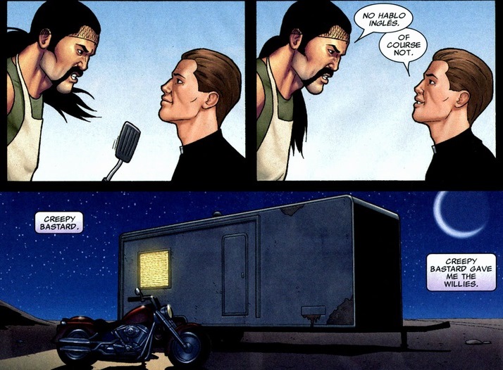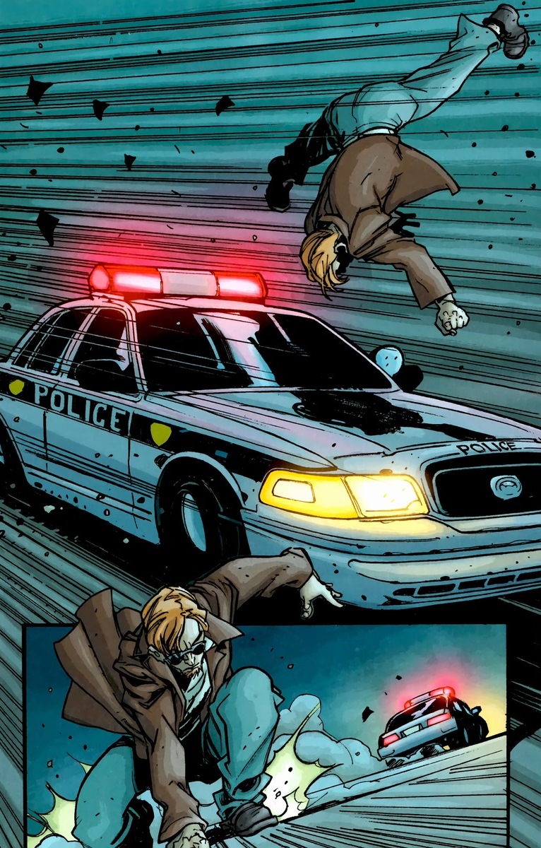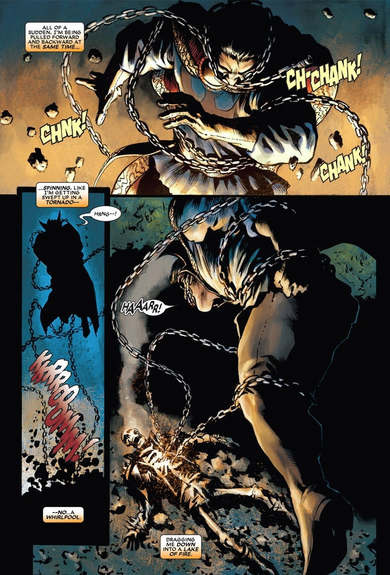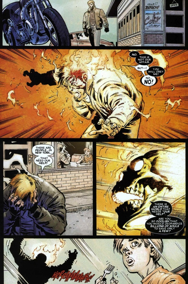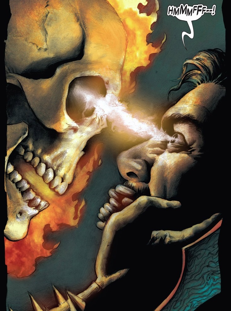 In Ghost Rider #2-3, volume six, written by Daniel Way and drawn by Javier Saltares & Mark Texeira, Johnny Blaze recently escaped from Hell the issue before. Unfortunately, he also unwittingly snuck the devil out as well, and now he has to kill all 666 versions of Lucifer roaming the country. Bad times. And then this happens: