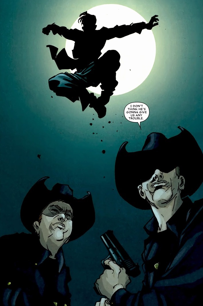 See? I told you reading all that dialogue would pay off. Look, besides Fraction being a genius writer, I believe the Nightcrawler’s message means simply this: the mutants of the world, who are persecuted and hated, will one day find the peace and acceptance they desire through not just physical and mental superiority, but moral as well. Which is pretty much exactly what Professor X preaches. While Scalphunter totally deserves to pay for the crimes and murders he committed, instead of simply awaiting another Scalphunter clone to eventually emerge, Nightcrawler changes the course of Scalphunter entirely.