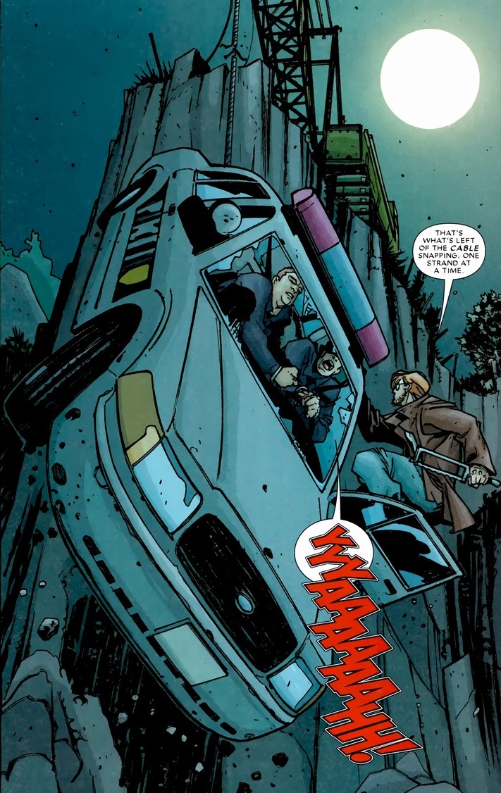 I’m not going cover most of the series. Like most of issues two and all of three. And the climax of issue four. But as the mystery cracks open and spills into Mexican druglords and all that other good stuff, the cops forget Daredevil has many useful ways to learn secret information. Like in his decades of watching thugs wet themselves when he jumps down from the skyscraper above them.