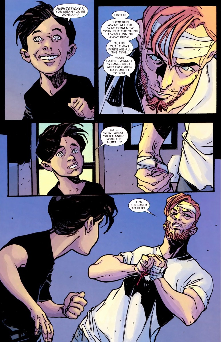 Now, we can’t call Murdock a wussy. The beatings serve to punish Daredevil for his actions in New York, and he accepts the physical pain as his redemption. To go along with his emotional and mental pain. Though he talks this time, poor Murdock doesn’t kung fu kick anybody across a diner. Yet.
