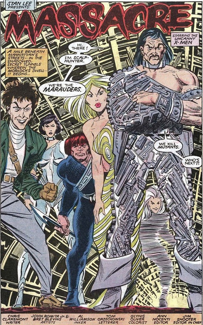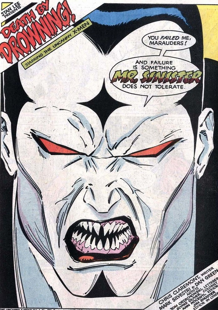 Notice that last thought box? I forgot to mention one of the most important parts: Scalphunter’s been dead for a long time. Y’see, the Marauders work for Mr. Sinister, quite possibly the most dangerous X-Men supervillain since Magneto switched sides. Proof from Uncanny X-Men #221, written by Chris Claremont and drawn by Mark Silvestri & Dan Green: