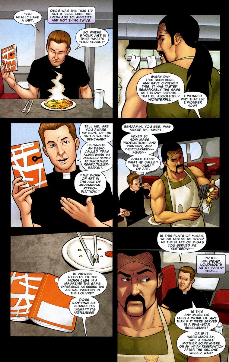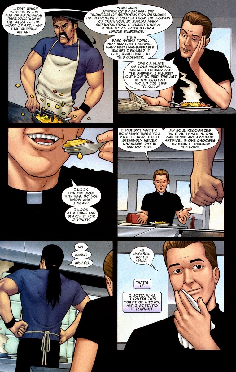 Scooby Doo antics aside, small town corruption remains very real in the Marvel universe. To be fair, so does big city corruption, but the Avengers don’t park their jet on a helipad in Kansas. As we jump into the story, Matt Murdock (because Daredevil never shows up) does what normal superheroes do when they enter foreign territory undercover — they go to a local diner. The Punisher alone has probably spent several waitress’ salaries worth of stale coffee and bad eggs.