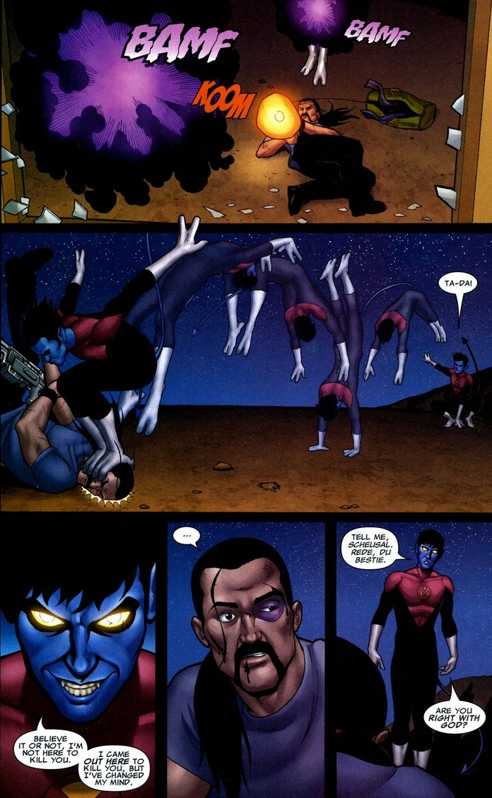 Yes, most proselytizing doesn’t begin with a jump kick to the face, but superheroes tend to attack first, convert second. Though Nightcrawler does make his scary soul-crushing point in the tenderest manner possible: