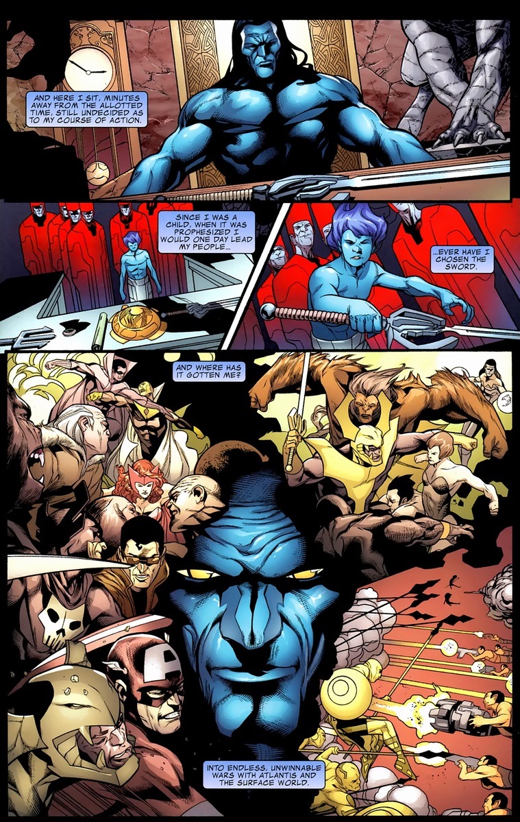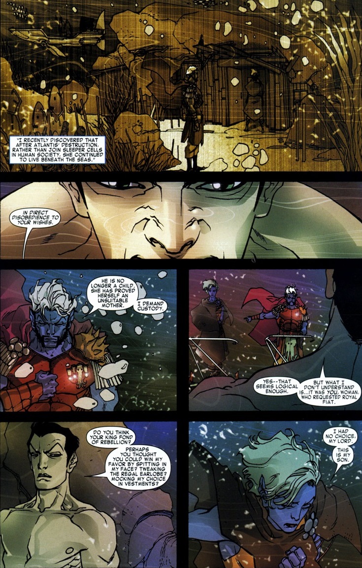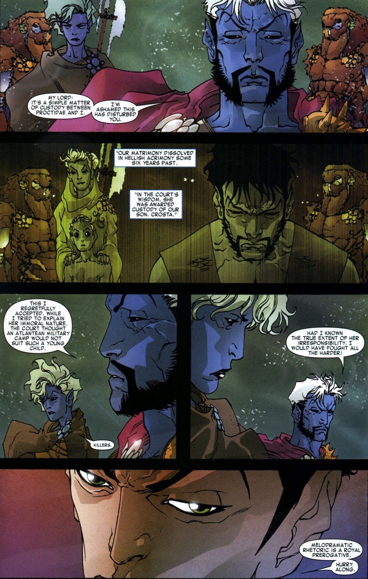 Namor sits like I do at work. Seriously, these Atlanteans should know better. Namor almost certainly left two mermaids and a DVD copy of Poseidon back in his chambers. To have to solve petty arguments is what biblical kings do, not scantily-clad sea monarchs. I’m saying Namor’s royal jewels are firmly on display, just not on his head.