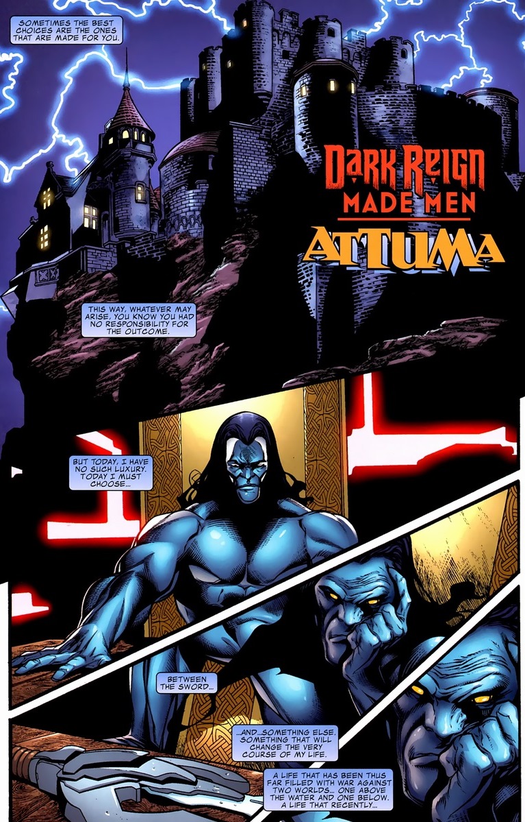 Posted: 10/23/2014 Filed under: Characters, Marvel Leave a commentYou know about Attuma, right? Not that Street Fighter character. Don’t worry, I don’t know who he is either until I looked him up about an hour ago. He battles Namor every now and then in his delusional attempts to conquer Atlantis and whatnot. If Aquaman gets a rogue gallery, Marvel’s Aquaman gets one too — that’s how competition works. In this short story from Dark Reign: Made Men one-shot, written by Frank Tieri and drawn by Rafa Sandoval, we get caught up on what happened to Attuma since his head exploded in Sentry #1.