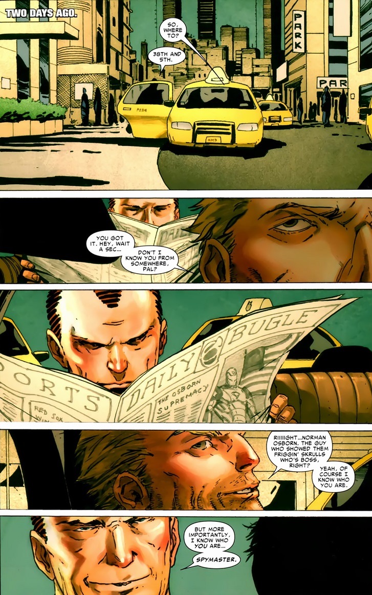 We jump back to the beginning of the Marvel event Dark Reign, where Norman Osborn has taken control of the nation’s security allowing him freedom to spread his corrupt and evil influence all throughout the country’s stuff (and things). First order of business? Petty revenge. What kind of supervillain would he be if it wasn’t? Oh, and meet Spymaster.