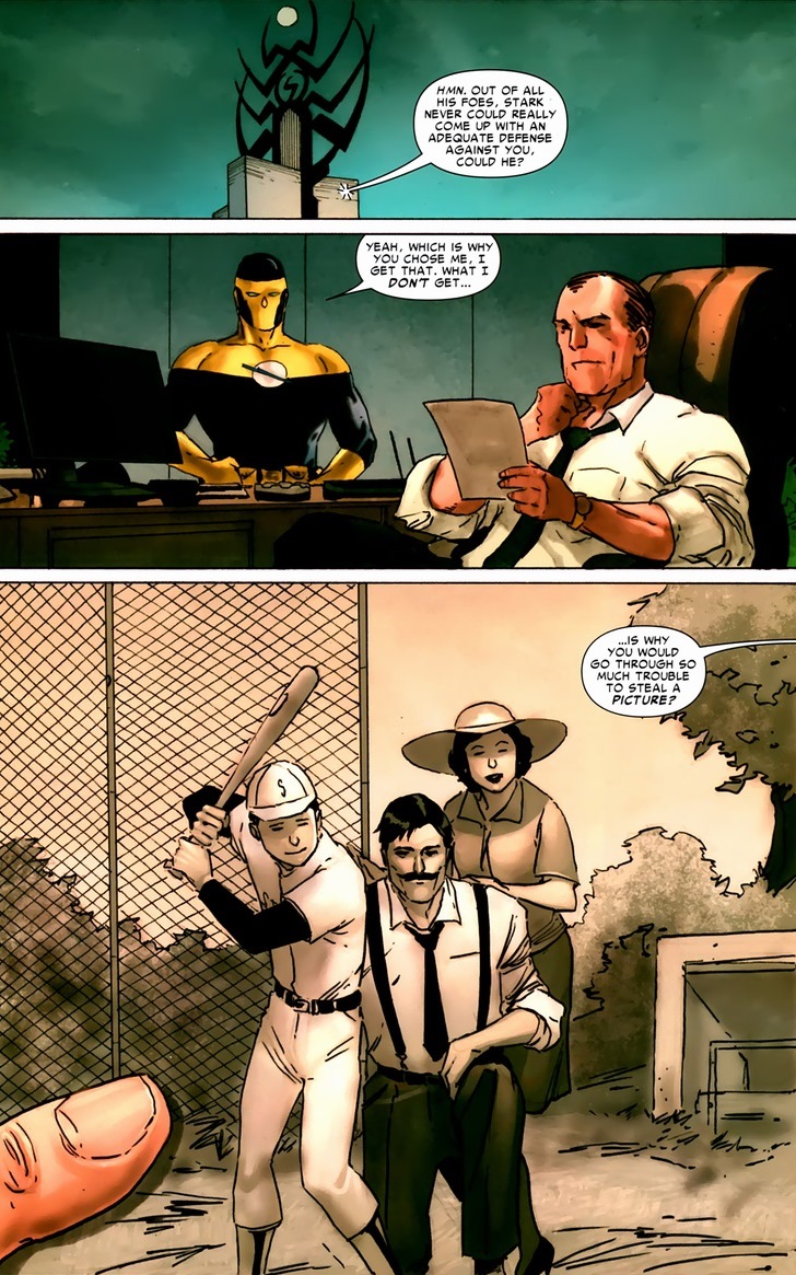 When Osborn asks you for a favor, you don’t have much of a choice. Those lasers from earlier? Looks like Spymaster’s reenacting that laser dance scene from Ocean’s Twelve. When it comes to refusal or failure, Osborn’s predecessors Nick Fury would yell and Iron Man would mope, but the former Green Goblin has no problem ruining. Hell, we’ve seen what he did to his own son, much less a C-list supervillain trying to stay under the radar. So the purpose of this job? Remember how Osborn disgraced Iron Man to get his job? This is called rubbing salt on the wound: