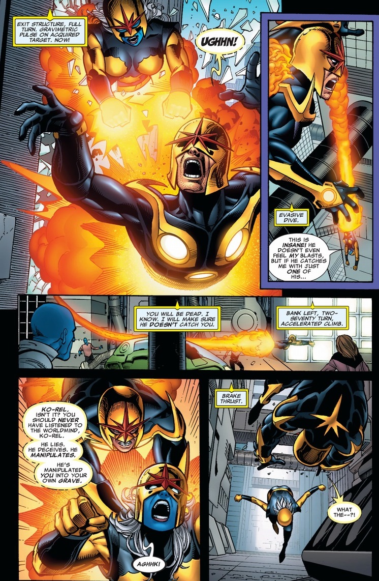 Now they’re both Phalanx-infested evildoers. Also, Gamora’s classic costume borders on wildly sexist. High heels, and essentially a voodoo prostitute’s swimsuit with a cape. If we’re going to dress the women like that, Rider should be showing one of his balls. That’s only fair. Anyway, poor Ko-Rel is tasked with taking down the fully-Nova-powered evil Nova. If Nova’s the Hulk, then Ko-Rel’s Bruce Banner. And I’m talking Bruce Banner with all science doohickeys. It’s more like Rider vs. a Ko-Rel/Worldmind team up.