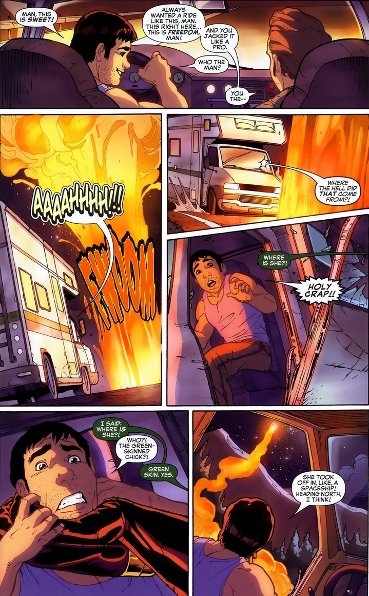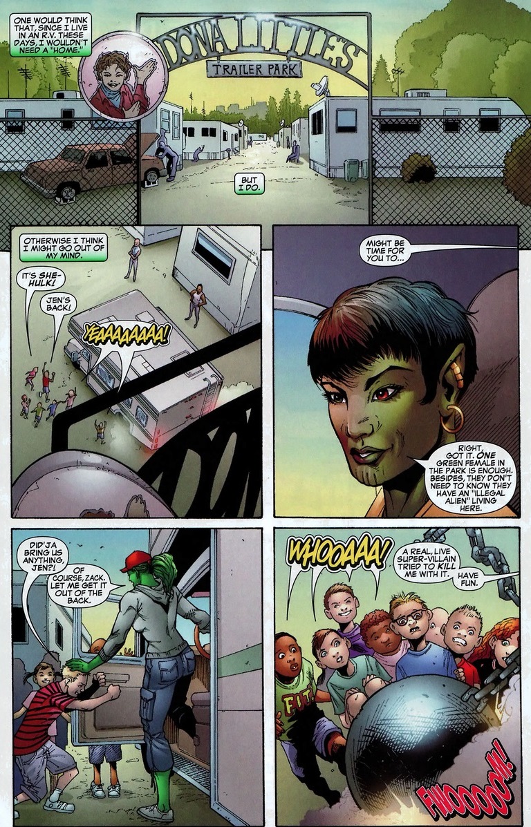 Allow me to briefly cover the She-Hulk/Iron Man feud. First, it’s bitterness over the aftermath of the Civil War. Second, they slept together, and he briefly took away all her superpowers. Well, he’s sorry, okay? More importantly, I like to think that Jazinda was so unable to handle real emotional talk from She-Hulk that she had no choice but to interrupt the conversation with a discussion-changing secret. The real reason probably lies in She-Hulk admitting she trusts Jazinda and the poor Skrull realizing she hasn’t been totally honest with her friend about her immortality, but either theory works. Personally, I’ve always been partial to stunted emotional failings in my characters.