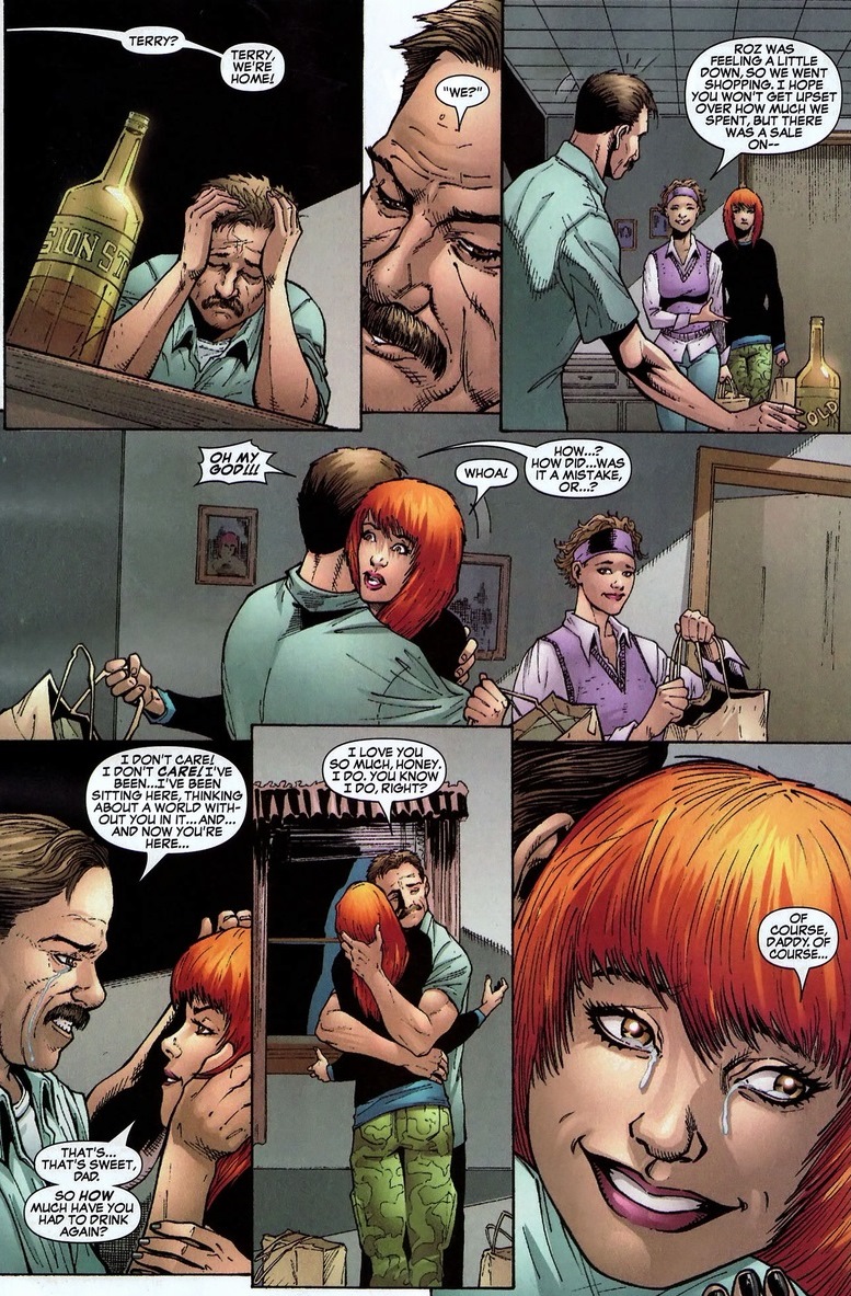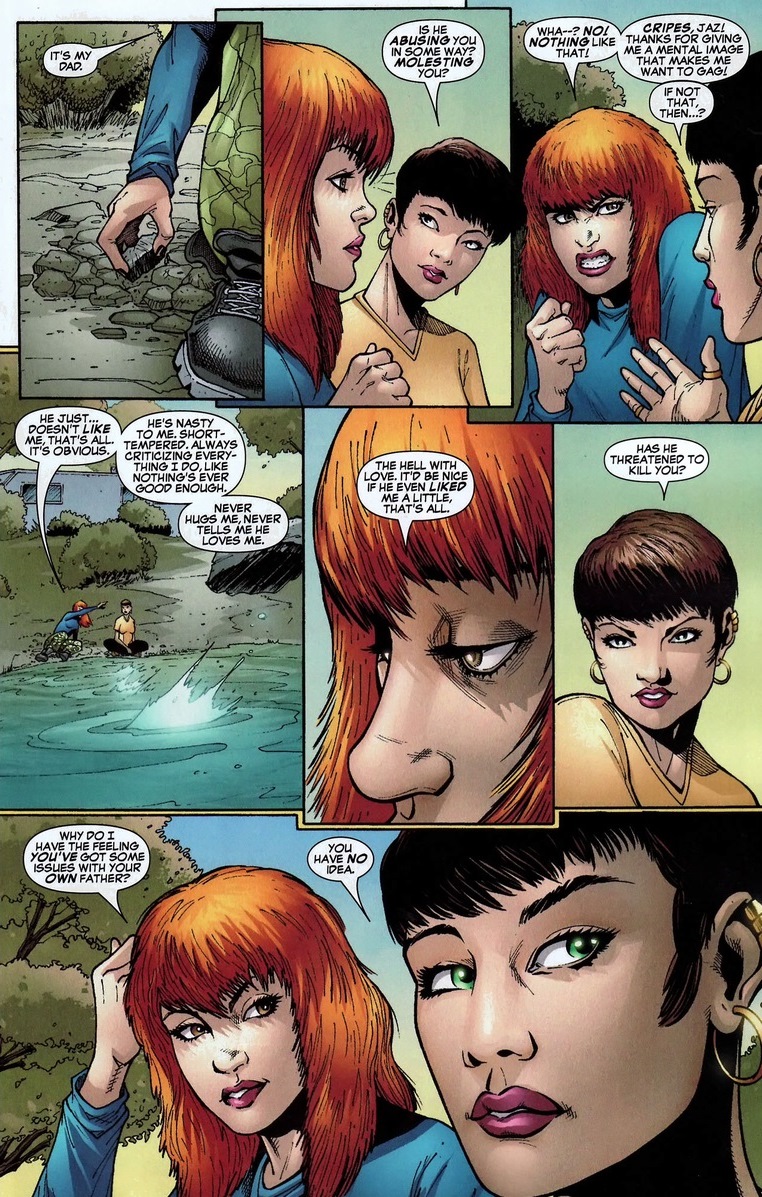 Let’s give Mary Jane Watson a break. She’s seen plenty of superheroes and supervillains up close by this point in her Ultimate Marvel universe life, but never the charred, bullet-ridden, almost-corpse of a half-yeti/half-man. Most importantly, she has to faint so Spider-Man can make that fantastic cinematic dive to catch her. Lucky for her, her lack of censorship when Wolverine wakes up makes up for a little of her fainting embarrassment. Also, she’s the only fifteen year-old to wear overalls who hasn’t just farmed for sixteen hours straight.