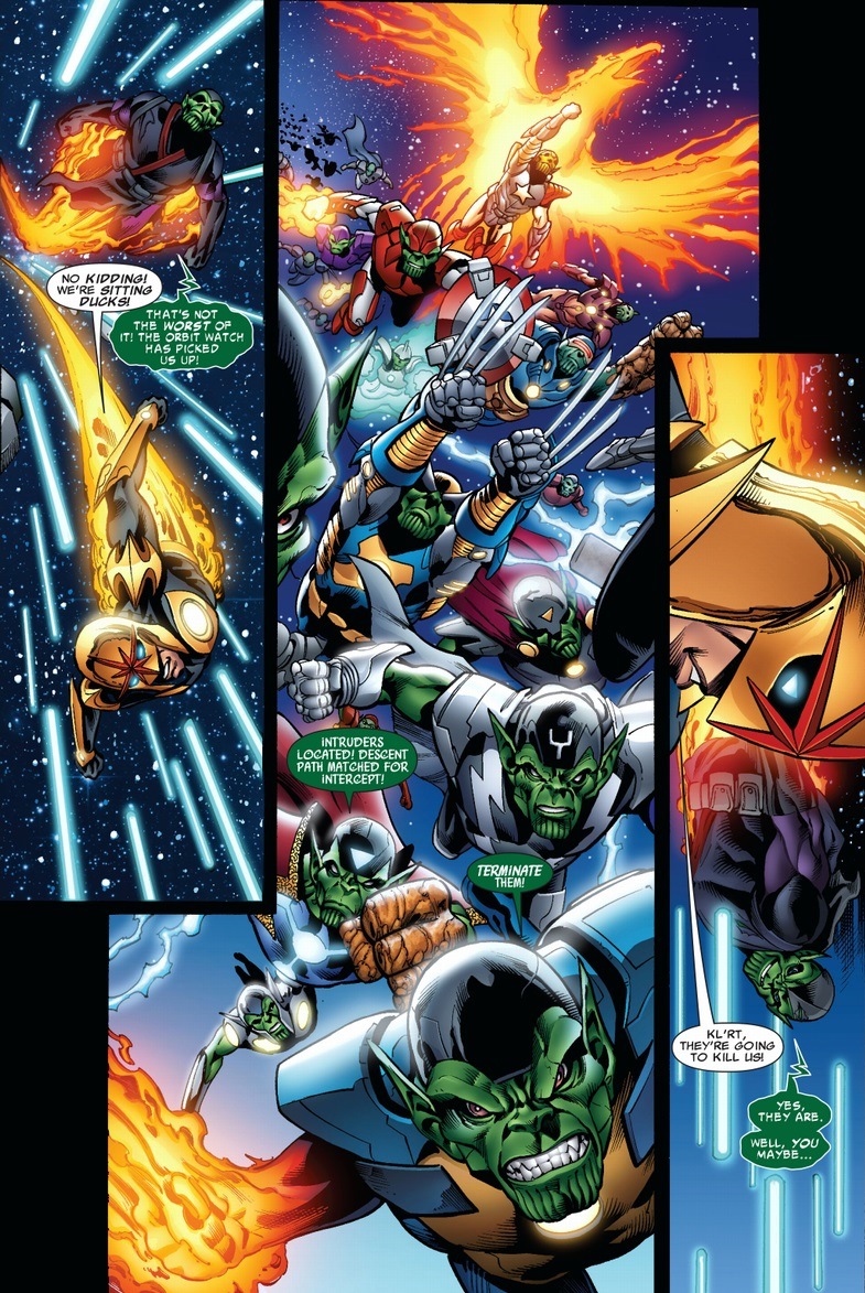 Posted: 08/19/2014 Filed under: Characters, Marvel 1 CommentAfter the Annihilation Wave almost destroyed all civilization, the Skrull empire collapsed. Warlords fought among themselves for control and whatnot. It happens. When the Skrull empire gets carefully pieced back together in that fragile manner diplomacy and lasers can accomplish, it’s time for them to show their superiority once more. They decide to invade Earth. Secretly. Hence begins the Marvel event Secret Invasion in which many of our favorite superheroes were secretly replaced with Skrulls over the past few months. Now, no one knows who can trust — shapeshifters can be sneaky. But we’re not talking about Secret Invasion today. Instead, we’re going to take a look at a scene across the galaxy from Nova #16-17, written by Dan Abnett & Andy Lanning and drawn by Wellinton Alves & Geraldo Burges.