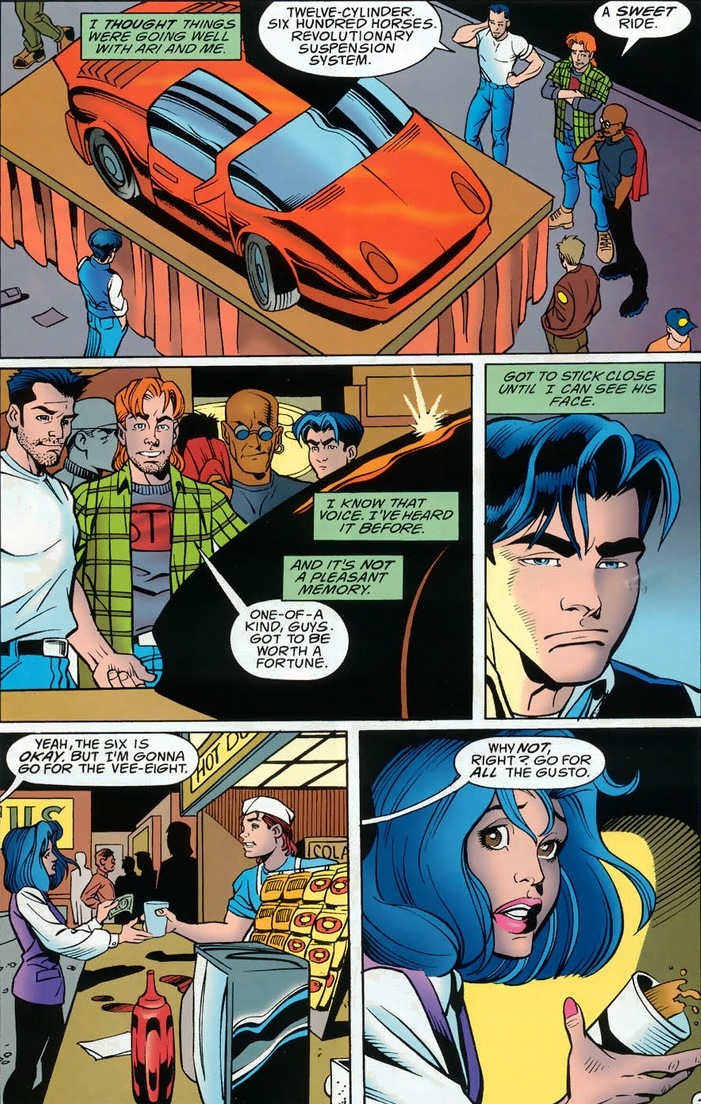 Let me try to explain this the best I can. In Robin #1-2, there’s a minor bad guy named Kurt Stack who runs a gang called the Speedboyz. Robin takes him out. We don’t see him again until Robin #31, written by Dixon and drawn by Mike Wieringo (which is also Stack’s final appearance) where at a car show, Ariana suddenly recognizes him. I’ve included the two pages here for you to see: