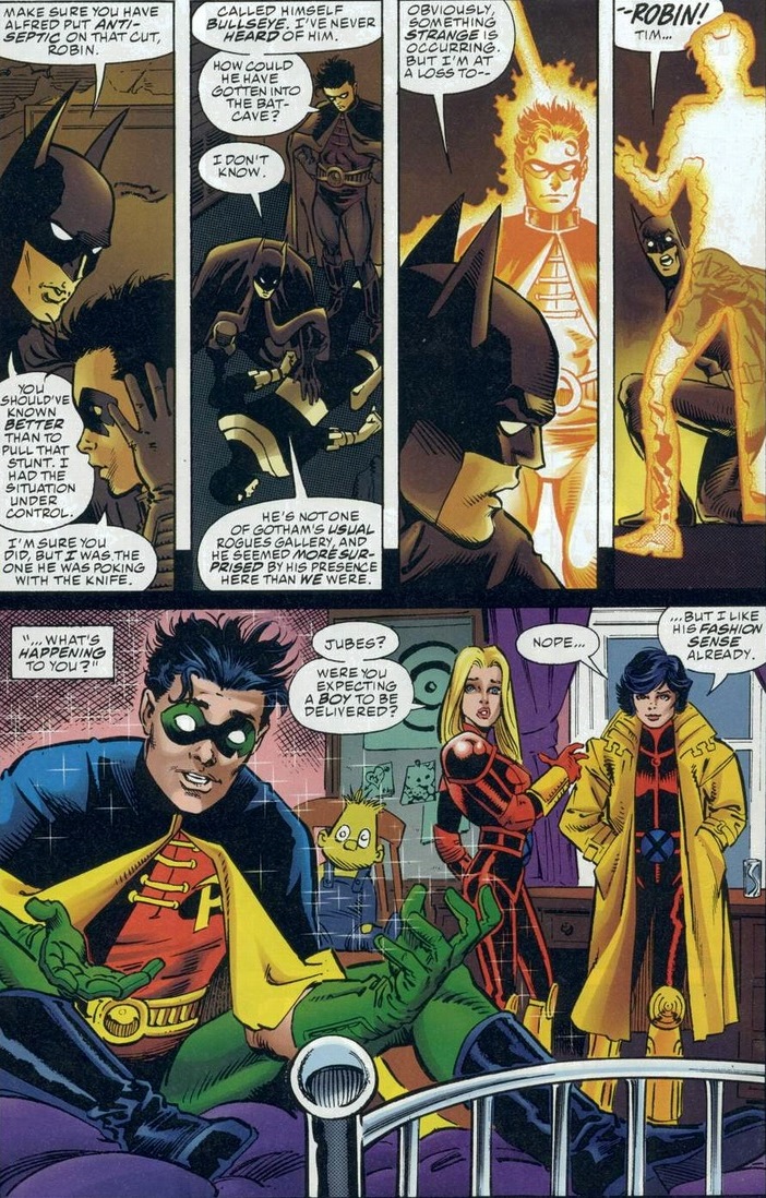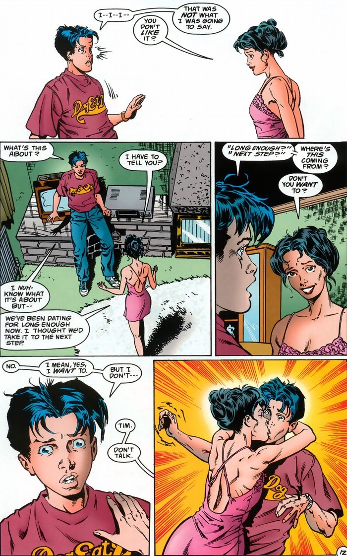 Posted: 06/26/2014 Filed under: DC, Relationships 2 CommentsTim Drake’s the first Robin we really saw “grow up” as Robin. I mean, sure, Dick Grayson took forty years to go through puberty, but his coming of age involved more chasing bad guys on giant piano keyboards and less frank relationship talks. Though he did almost marry Starfire. And dated Batgirl for a long time. Look, so Dick Grayson’s not a good example. But today, Tim has to confront a problem for the first time that batarangs and kicks to the face won’t solve: teenage love. In Robin #40-41, written by Chuck Dixon and drawn by Staz Johnson, our dear protagonist has to make a choice when he’s finally at bat for his home run. Cue after school special: