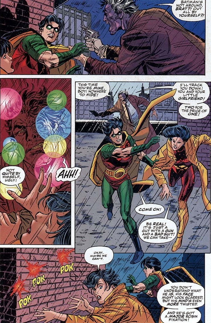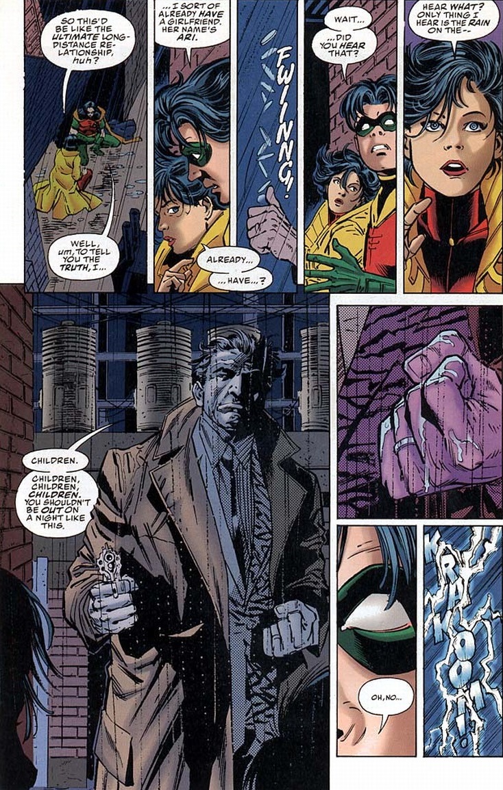 In this series, Robin’s petrified of Two-Face. Like Harvey Dent’s the Darkseid of Gotham City. I understand that Two-Face’s a good shot and such, but so is 90% of the bad guys Robin battles every night he goes on patrol. For the sake of this story, Two-Face is someone to be feared. Robin’s blood freezes as a grown man wanders the soaked streets looking for children to shoot. Plot-wise, what’s about to happen works — the goal to heighten suspense and give the two young superheroes a legitimate challenge is totally achieved. But just how dangerous is Two-Face really? Couldn’t Jubilee light a Roman candle under his chin followed with Robin’s kick to the face? Down goes the supervillain.
